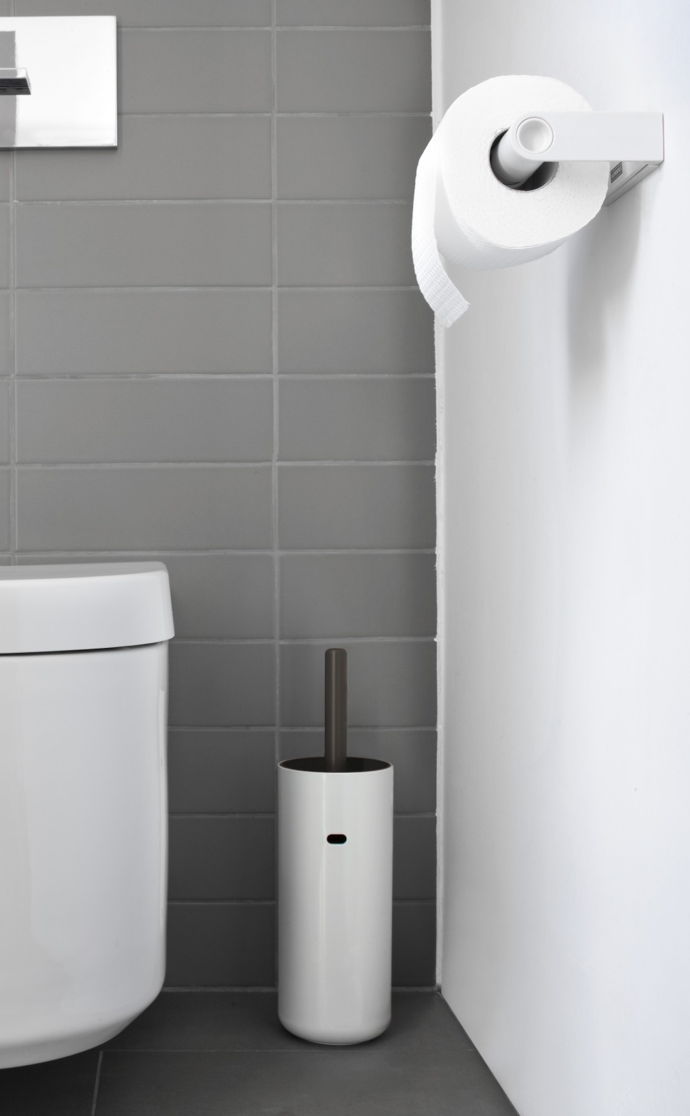 Die Lunar WC-Bürste von Depot4Design ist Teil der gleichnamigen Badzimmer-Kollektion der Designer Edward Barber und Jay Osgerby. Wie einen Säbel zieht man die Bürste aus der Hülle. Der integrierte Deckel schützt die Hände während des Putzens vor Spritzwasser. Der Bürstenkopf kann abgeschraubt und ersetzt werden. Durch ein längliches Loch im Bürstenhalter kann die Lunar WC-Bürste besser trocknen. Die WC-Bürste besteht aus dickwandigem ABS-Kunststoff und Nylon. Passend zu den anderen Produkten der Lunar-Kollektion von Depot4Design besitzt auch die WC-Bürste ein rundliches Design, das ganz ohne Ecken auskommt. Auch farblich passt die WC-Bürste in die Kollektion: Der Ständer ist in schlichtem, hochglänzendem Weiß gehalten, während der Bürsteneinsatz farbig-matt erscheint.