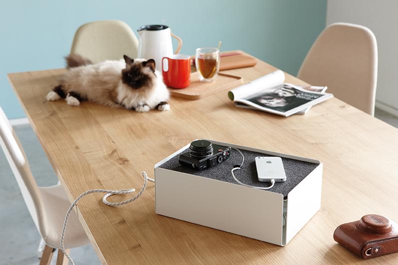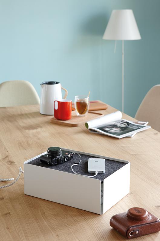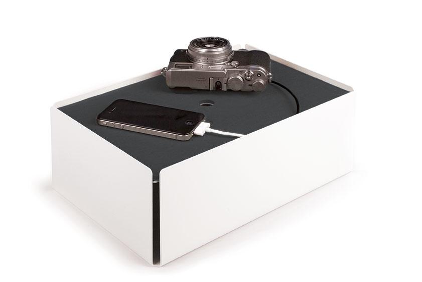 Die CHARGE-BOX von Konstantin Slawinski fungiert mit ihrem pulverbeschichteten Stahlgehäuse und der dazugehörigen Auflage als Ladestation für mehrere elektronische Geräte. Unter der Auflage können Sie störende Kabel ordentlich verstauen. Somit können Sie den Kabelsalat verstecken und bekommen zusätzliche Sicherheit bei Haustieren und Kindern. Im Korpus, der in zahlreichen Farben erhältlich ist, findet eine Mehrfachsteckdose für Ihre Ladegeräte platzt.
