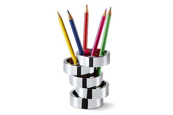 Der variable Stifthalter Rotondo von Philippi ist durch sein intelligentes Design unverzichtbar in Ihrem Büro. Sie mögen es schlicht und unauffällig, dann ordnen Sie die einzelnen Elemente geordnet übereinander an. Sie bevorzugen ein ausgefallenes Design, dann drehen Sie die runden Elemente des silbernen Stifteköchers nach Belieben in alle Richtungen und befüllen Sie anschließend den hochglanzpolierten Stifthalter. Aber nicht nur im Büro, sondern auch im Bad kann die praktische Aufbewahrungsmöglichkeit für Pinsel. Faszinierend und praktisch zugleich und somit unverzichtbar für Ihr Zuhause.