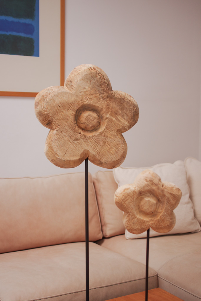 Handgefertigt aus Holz und robustem Metall, sieht dieses atemberaubende Dekorationsobjekt nicht nur stilvoll aus, sondern hält auch dem Test der Zeit stand. Problemlos können Sie die Holzblume mit anderen Dekoartikeln in Ihrem Zuhause kombinieren. Von traditionellen Möbeln bis hin zu zeitgenössischen Stilen - diese Blume wird in jedem Raum auffallen. Der Metallsockel verleiht ihr ein zeitloses Aussehen, das sowohl ins Auge sticht als auch charmant ist. Die kunstvoll gestaltete Holzblume, die auf dem Sockel steht, trägt zu ihrem einzigartigen Design bei. Jedes Stück ist sorgfältig aus massivem Holz geschnitzt, wobei die feinen Details individuelle Nuancen aufweisen, die jede einzelne Blume zu etwas ganz Besonderem machen.