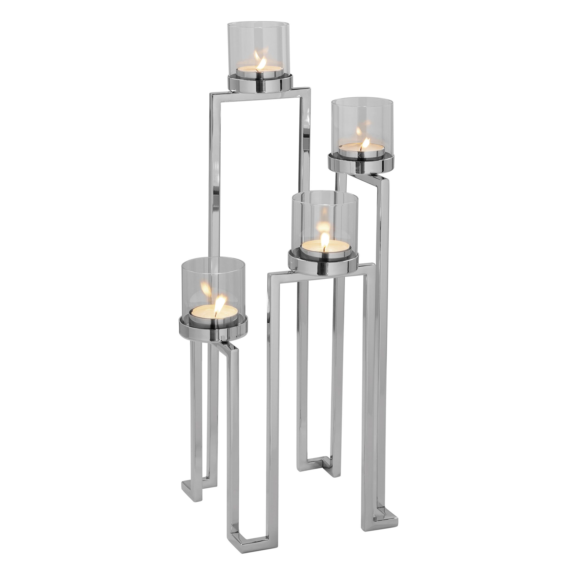 Der GRANT moderner Bodenteelichthalter - silber von Fink besticht durch seine klare geometrische Form und das moderne, minimalistische Design. Mit einer Höhe von 56 cm und einem Durchmesser von 22 cm fügt sich der vernickelte Kerzenständer elegant in jedes Interieur ein. Vier abnehmbare Gläser (Modell Melody) gehören zum Lieferumfang und eignen sich ideal für Maxi-Teelichter, die dem Raum ein warmes, heimeliges Licht verleihen.