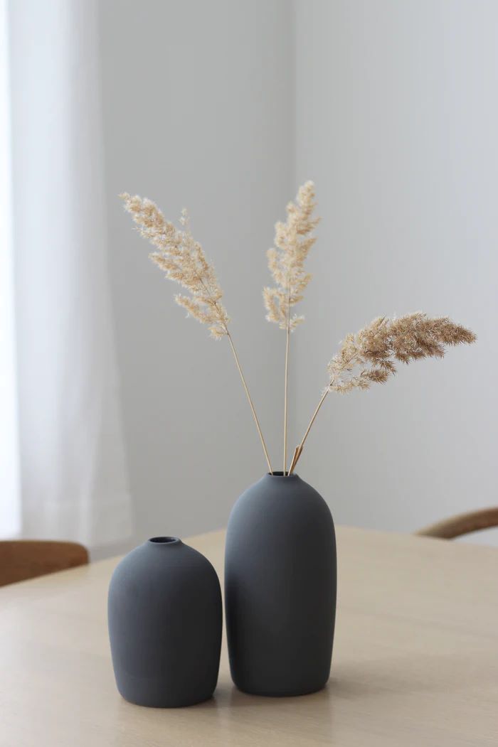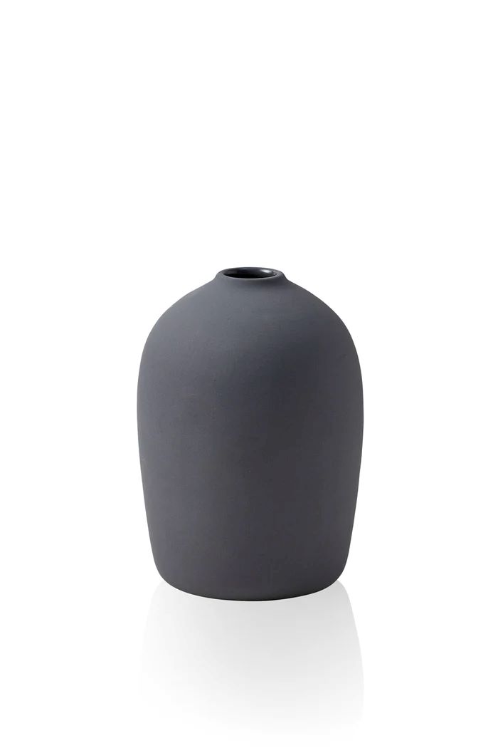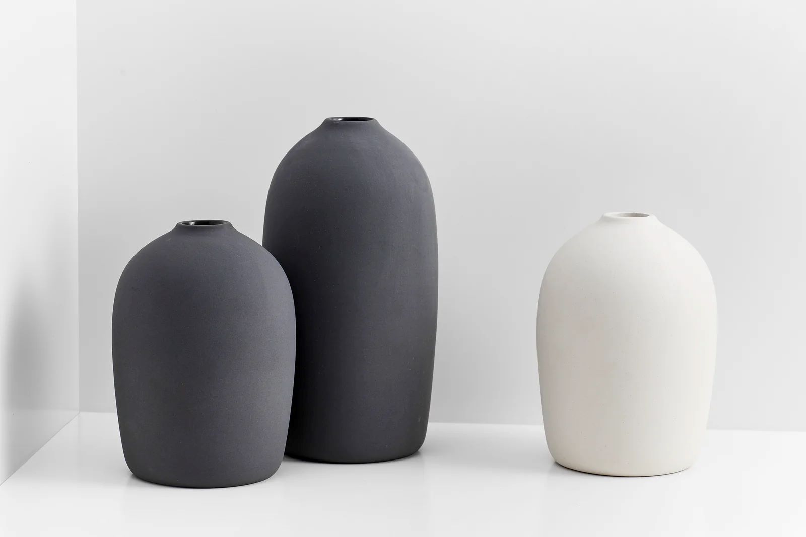 Die Raw zylindrische Keramikvase mit kleiner Öffnung von Novoform besticht durch ihre schlichte und organische Silhouette. Die Vase ist in zwei Größen und zwei klassischen Farbtönen erhältlich – einem sanften Weiß und einem dunklen, gedämpften Grau, die sich problemlos in jedes moderne Interieur einfügen.