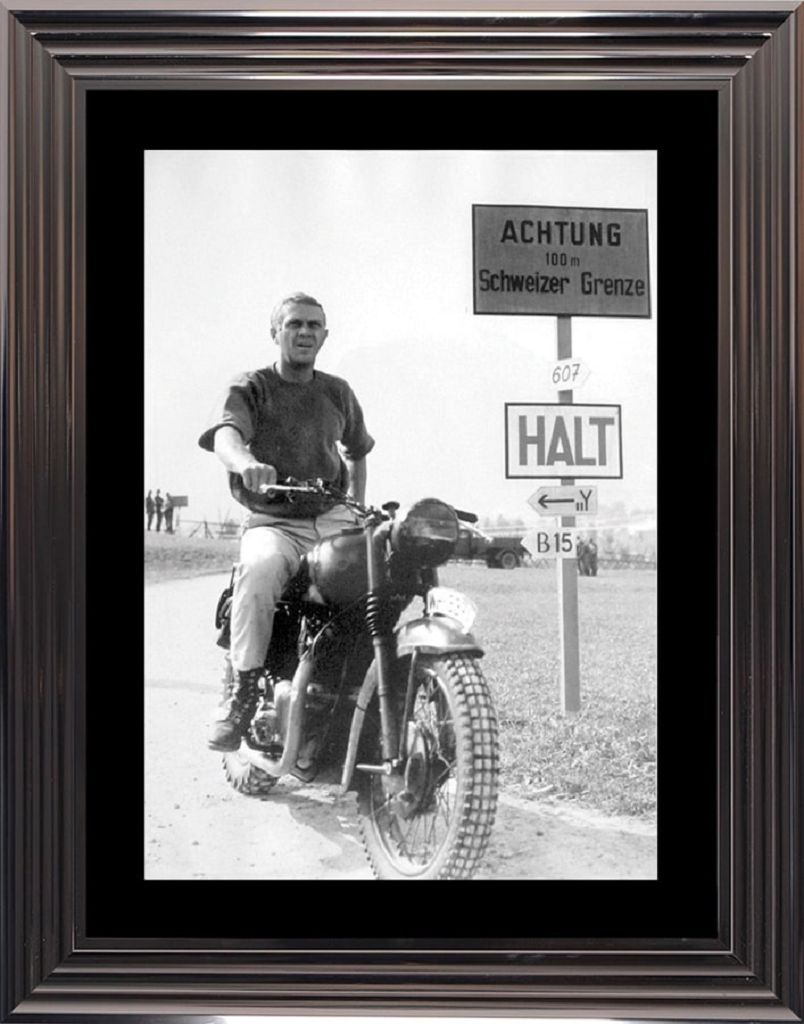 Auf dem Bild ist der Schauspieler Steve McQueen ,aus dem Film "Grande Evasion", wo er Captain Virgil Hilts spielte, abgebildet. Das Bild ist schwarz weiß gedruckt und erzeugt einen schönen Retrostil in Ihrem Zuhause. Ideal für alle Filmbegeisterte und Retrofans.