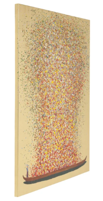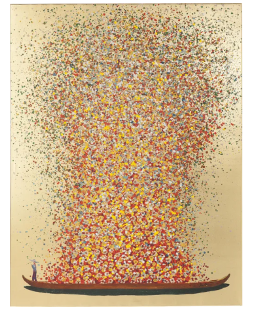 Das Bild "Touched Flower Boat" in Gold-Rot von Kare ist ein eindrucksvolles Wandbild mit den Maßen 100 x 80 cm. Auf hochwertiger Baumwolle (Canvas) gedruckt und detailreich mit Acrylfarbe handbemalt, zeigt es ein prachtvolles Meer aus zarten Blüten in lebhaften Gelb- und Rottönen vor goldenem Hintergrund.