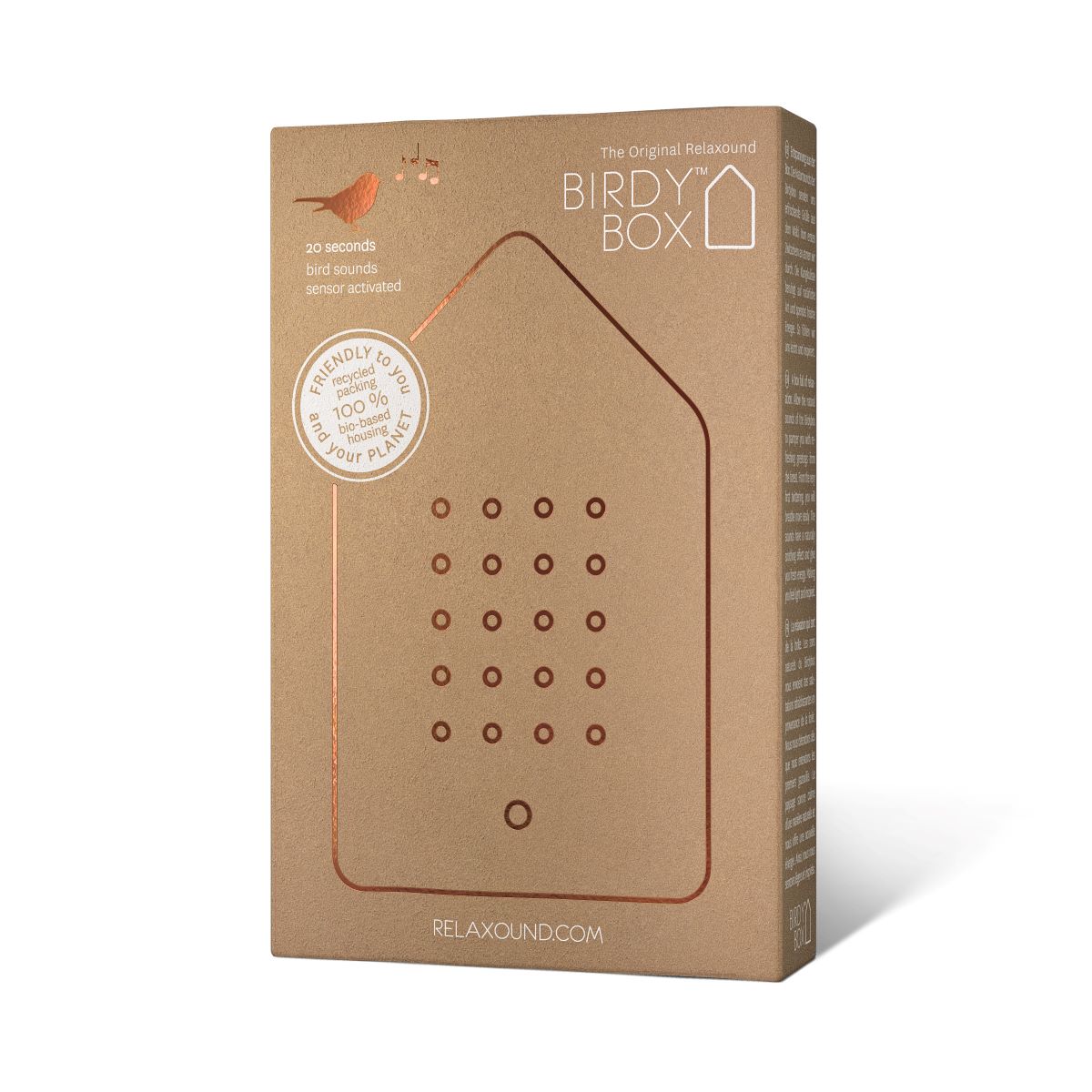 Die Birdy Box Plexiglas von Relaxound ist Entspannung auf höchstem Niveau. Sie ist eine kleine Box, die mit einem Bewegungssensor ausgestattet ist. Wenn dieser Bewegungssensor, zum Beispiel durch Vorbeigehen aktiviert wird, löst er einen entspannenden Vogelgesang aus, der nach 20 Sekunden wieder abklingt. So verströmt die Box Ruhe und eine angenehm gelassene Atmosphäre. Die Lautstärke des Vogelgezwitschers der Birdy Box kann je nach persönlichen Vorlieben eingestellt aber auch ausgeschaltet werden. Die Birdy Box kann entweder im Büro oder zu Hause im Eingangsbereich oder im Bücherregal aufgestellt oder an die Wand gehängt werden. Aufgeladen wird Sie per USB-Kabel mit einem umweltfreundlichen Akku. Die Akkulaufzeit beträgt je nach Nutzung circa zwei Monate. Das Gehäuse und die Verpackung sind biologisch abbaubar. Somit bringen Sie nicht nur die Natur zu sich nach Hause, sie schützen sie auch gleichzeitig noch. Das alles macht die Birdy Box zu einem ganz besonderen Designartikel.