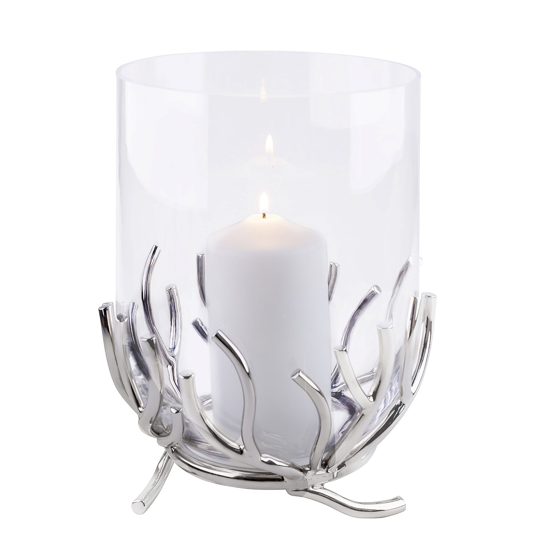 Hergestellt aus hochwertigem, vernickeltem Aluminium, präsentiert sich das Windlicht in einem eleganten Silberton, der ihm eine zeitgemäße und stilvolle Ausstrahlung verleiht. Die besonderen silbernen Verästelungen, die das Glasgefäß umschlingen, erinnern an zarte Zweige und verleihen dem Windlicht einen einzigartigen, organischen Charme. Diese harmonische Kombination aus Metall und Glas schafft eine faszinierende Lichtstimmung, die sowohl gemütlich als auch modern wirkt.