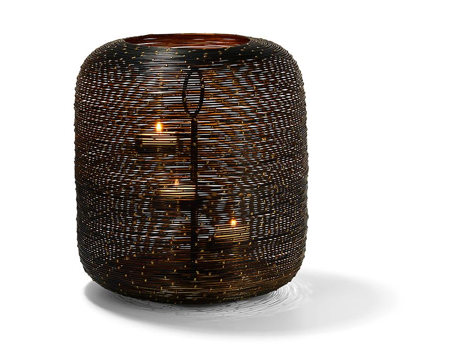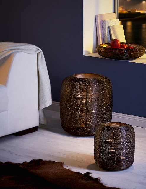 Das Botswana Windlicht von Philippi ist ein aus feinem Drahtgeflecht gefertigtes Windlicht. Von innen Gold und von außen schwarz, dadurch entsteht ein einzigartiges Lichtspiel, welches an einen Sternenhimmel erinnert. Zierliche eingearbeitete Goldpunkte stellen kleine Sterne nach, die durch das entzünden der Kerzen in den drei Höhen-versetzten Teelichthaltern im Inneren zum Vorschein kommen. Durch den kleinen Ring im Inneren kann das schwarz-goldene Windlicht ganz einfach transportiert werden. Besonders bei kühleren und dunkleren Tagen verzaubert der Teelichtbehälter eine romantische Stimmung in Ihrem Wohnraum.