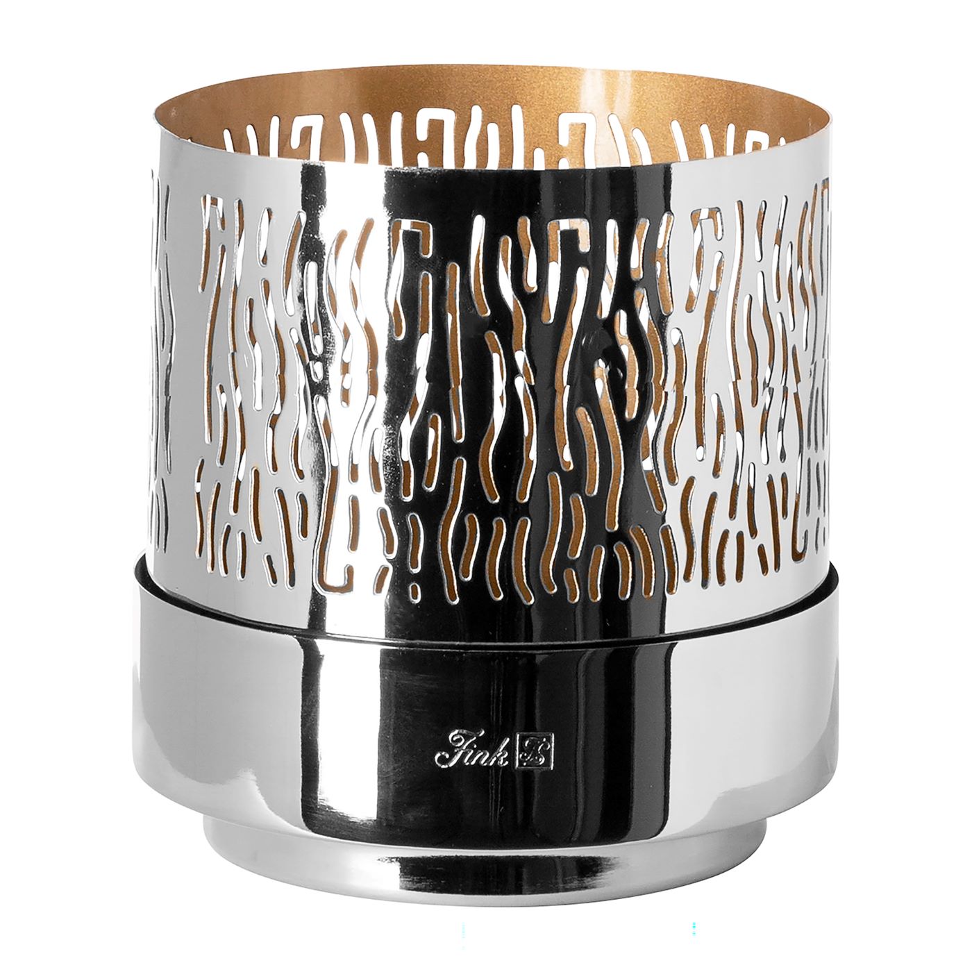 Das silberne Windlicht Marian - wellenförmiges Muster von Fink ist ein faszinierendes Wohnaccessoire, das mit seinem wellenförmigen Muster eine bezaubernd-sanfte Lichtstimmung nach Sonnenuntergang kreiert. Dieses elegante Windlicht besticht durch seine silberne Oberfläche, die im Inneren mit einem goldfarbenen Glanz akzentuiert ist und somit für einen besonderen Kontrast sorgt. Ideal, um stimmungsvolle Akzente in Ihrem Zuhause zu setzen!