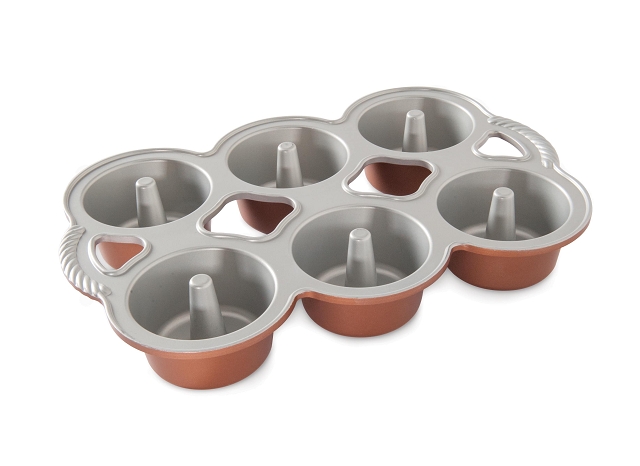 Mit der Nordic Ware Backform Angel Bundtlette Mini-Kuchen zaubern Sie zugleich 6 wundervolle kleine Küchlein oder Dessert Stücke die an das bekannte Donut Gebäck erinnern. Mit der Kuchenform aus Aluminiumguss gelingen Ihnen kleine Leckereien, die Sie dann mit Zuckerguss oder Puderzucker zu kleinen Gaumenfreuden gestalten können und die Ihre Liebsten aber natürlich auch Ihr Besuch lieben werden. Dank der Antihaftbeschichtung gelingen die kleinen Wunderwerke jedes Mal. Die Form nur mit einem sanften Spülmittel per Hand reinigen. Die Form ist nicht Spülmaschinen geeignet.