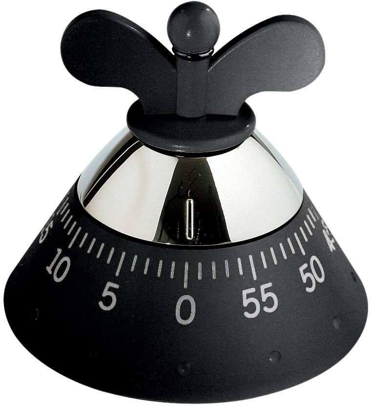 Falls Sie nicht in der Küche warten wollen, bis Ihre Speisen fertig sind, dann eignet sich der "Kitchen Timer" in Schwarz von Alessi ideal. Mit der Eieruhr können Sie die gewünschte Zeit mit der Flügelschraube bis zu 60 Minuten einstellen. Nach Ablauf der Zeit rasselt der Kurzzeitmesser unüberhörbar. Das Gehäuse ist aus schwarzem, thermoplastischem Harz, und die Eieruhr besitzt ein mechanisches Werk.