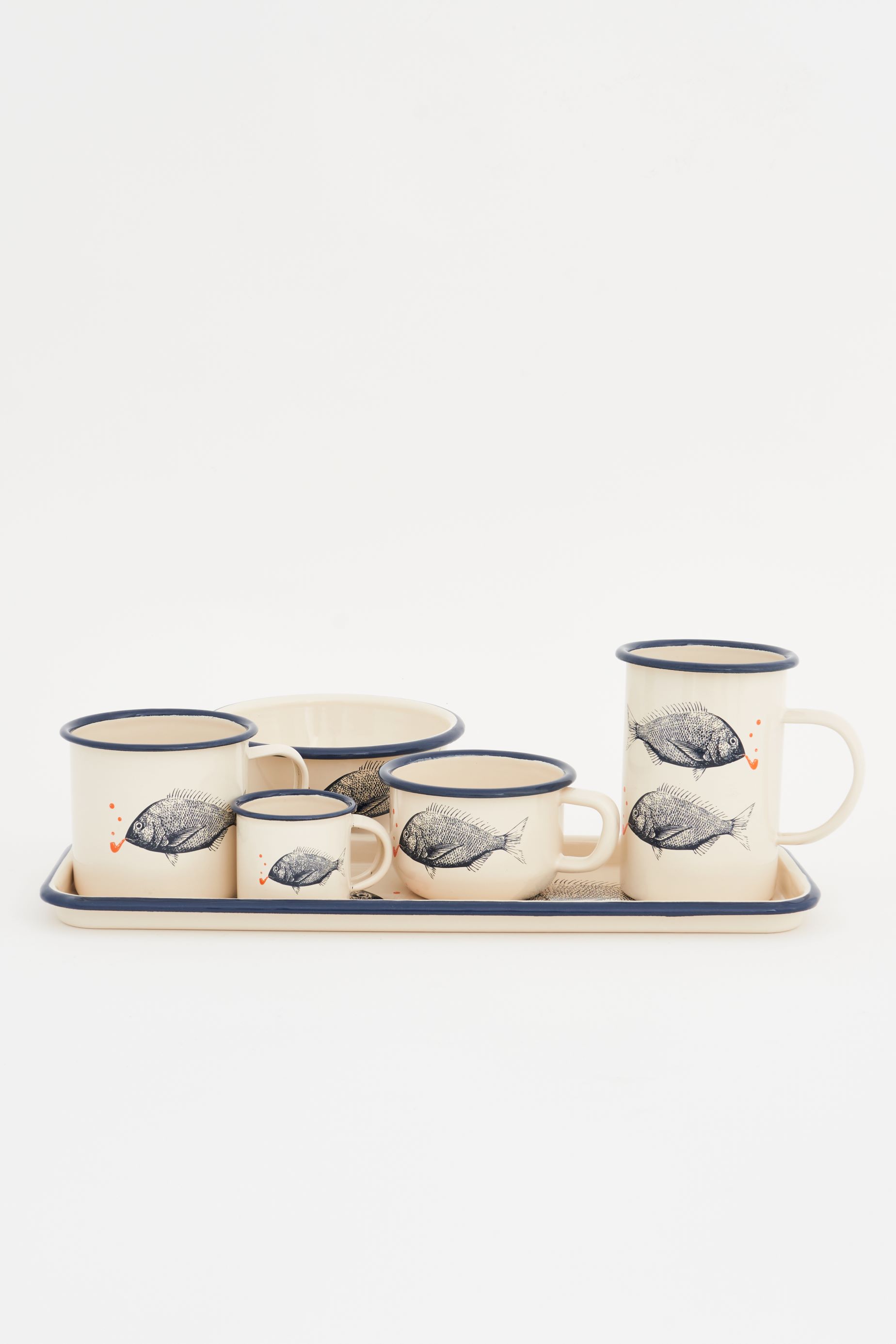 Bringen Sie mit der Metallschüssel mit Fischmotiv rund aus Emaille von Batela die Schönheit der Küste direkt zu Ihnen nach Hause und genießen Sie stilvolles und funktionales Geschirr mit maritimem Flair.
