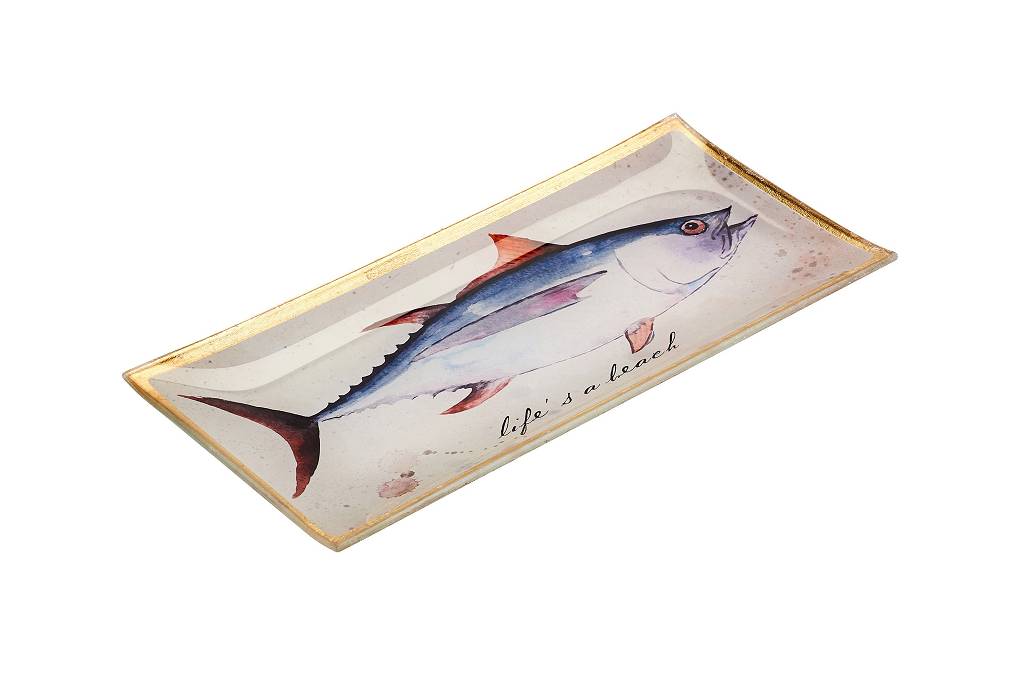 Der Glasteller Life´s a beach, Goldrand, beige von Giftcompany ist in der Mitte mit einem detailreichen Fisch und einem Schriftzug Life´s a beach bedruckt. Die Besonderheit bei diesem Teller ist der Goldrand, welcher handgemalt wurde. Der Glasteller kann als Servierteller für Snacks oder Kuchen verwendet werden.