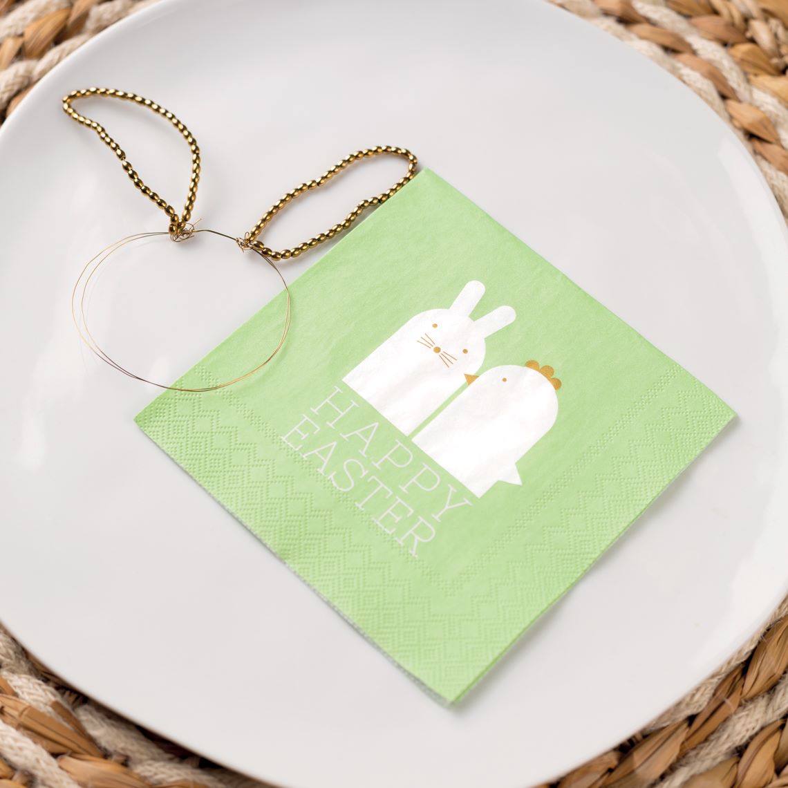 Die Servietten sind in einem erfrischenden Farbschema aus Grün und Weiß gestaltet, das die Leichtigkeit des Frühlings und die Freude des Osterfestes widerspiegelt. Der zarte Aufdruck „Happy Easter“ macht sie zu einem charmanten Blickfang auf jedem Tisch – ideal für alle, die das Osterfest mit einem Hauch von Stil feiern möchten.