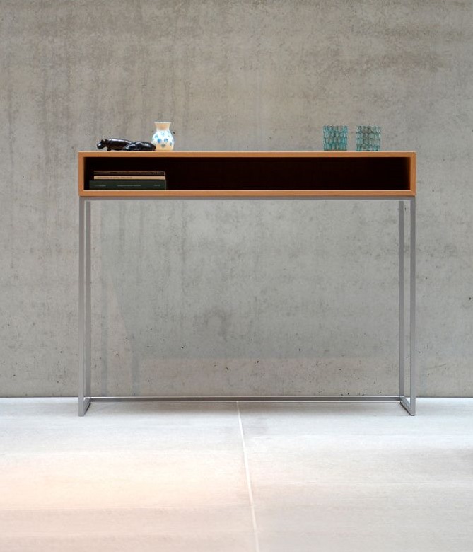 Der Konsolentisch Dina von Jan Kurtz bietet mit seiner praktischen Ablage doppelten Stauraum. Sie können sowohl auf als auch in der Ablage Gegenstände und Dekorationsartikel unterbringen. Bei Bedarf kann die Ablage abgenommen werden. So lässt sich der Tisch besonders einfach reinigen. Das Gestell ist aus geschliffenem Edelstahl oder pulverbeschichtetem Stahlrohr. Die Ablage ist in vier verschiedenen Farben erhältlich.