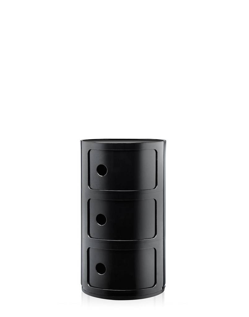 Der Componibili Recyceld Container mit drei Elementen von Kartell sticht durch sein rundes Design hervor. Das Besondere ist, Sie können den Container als Aufbewahrungsmöbel oder als Beistellmöbel am Bett verwenden. Ganz einfach lässt sich der recycelte Container aus drei Ablagefächern durch Grifflöcher öffnen,. Die Maße der Aufbewahrungsbox sind 58,5 cm hoch und der Durchmesser ist 32 cm. Das Material ist thermoplastisches Technopolymer, es ist stabil und robust. Das runde Design passt sich in jedem Zimmer in Ihrem Zuhause an, auch die Farbauswahl zwischen schwarz und weiß lässt sich zu jedem Einrichtungsstil kombinieren. Der Componibili Recyceld Container ist bei uns im Shop auch mit zwei Elementen erhältlich.