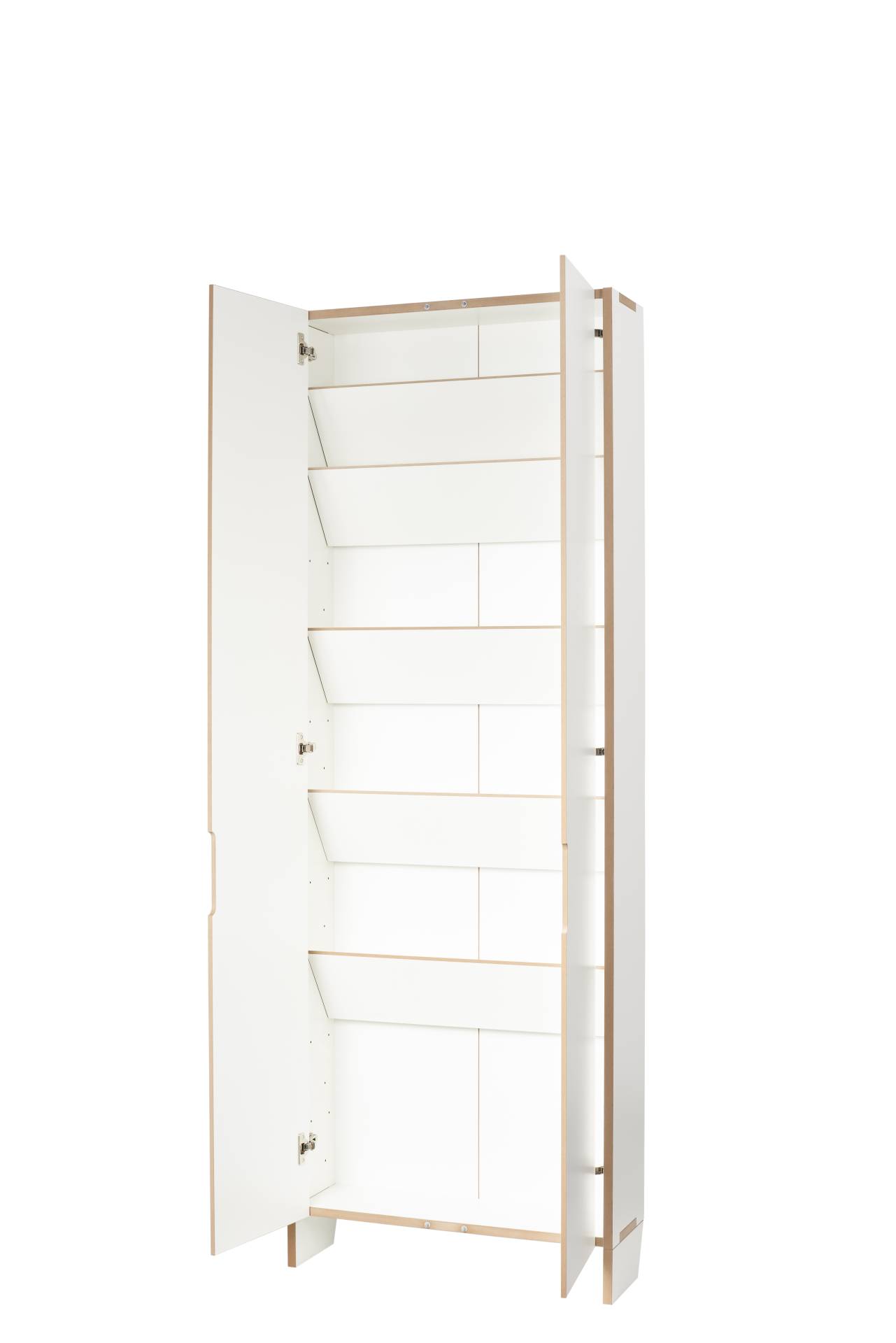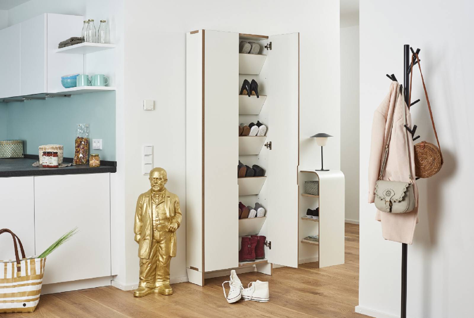 Wir stellen vor: Fachmann Schrank von Tojo. Bewahren Sie all Ihre wertvollen Besitztürmer an einem einzigen Ort auf - mit diesem auffälligen und zugleich funktionalen Wandschrank! Diese geräumige Aufbewahrungslösung mit fünf Fächern ist 23 cm tief und eignet sich daher ideal für kleinere Räume oder Orte, an denen Sie die Einrichtung aufpeppen möchten. Ganz gleich, ob Sie ein langlebiges Schuhregal oder einfach nur eine ordentliche Ablage für Bücher und Krimskrams suchen, mit dem Flachmann Schrank hat man alles, was Sie brauchen. Die Regalböden können je nach Bedarf schräg oder gerade angebracht werden, wobei die erste Variante besonders für Schuhe geeignet ist. Der Holzschrank kann bis zu 15 Paar Schuhe aufnehmen, insgesamt können Sie bis zu 10 Ablagen nutzen (5 Böden sind im Lieferumfang enthalten). Die Regalböden können zusätzlich im 5er-Pack erworben werden. Richten Sie Ihren Flur oder Eingangsbereich mit dem Flachmann Schrank von Tojo neu ein!