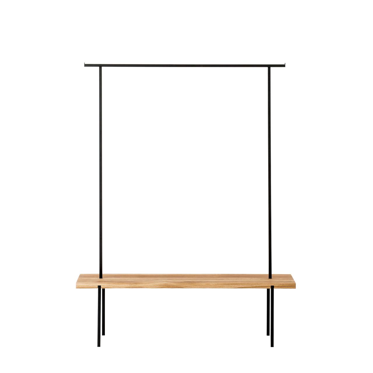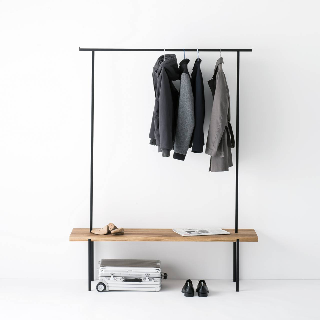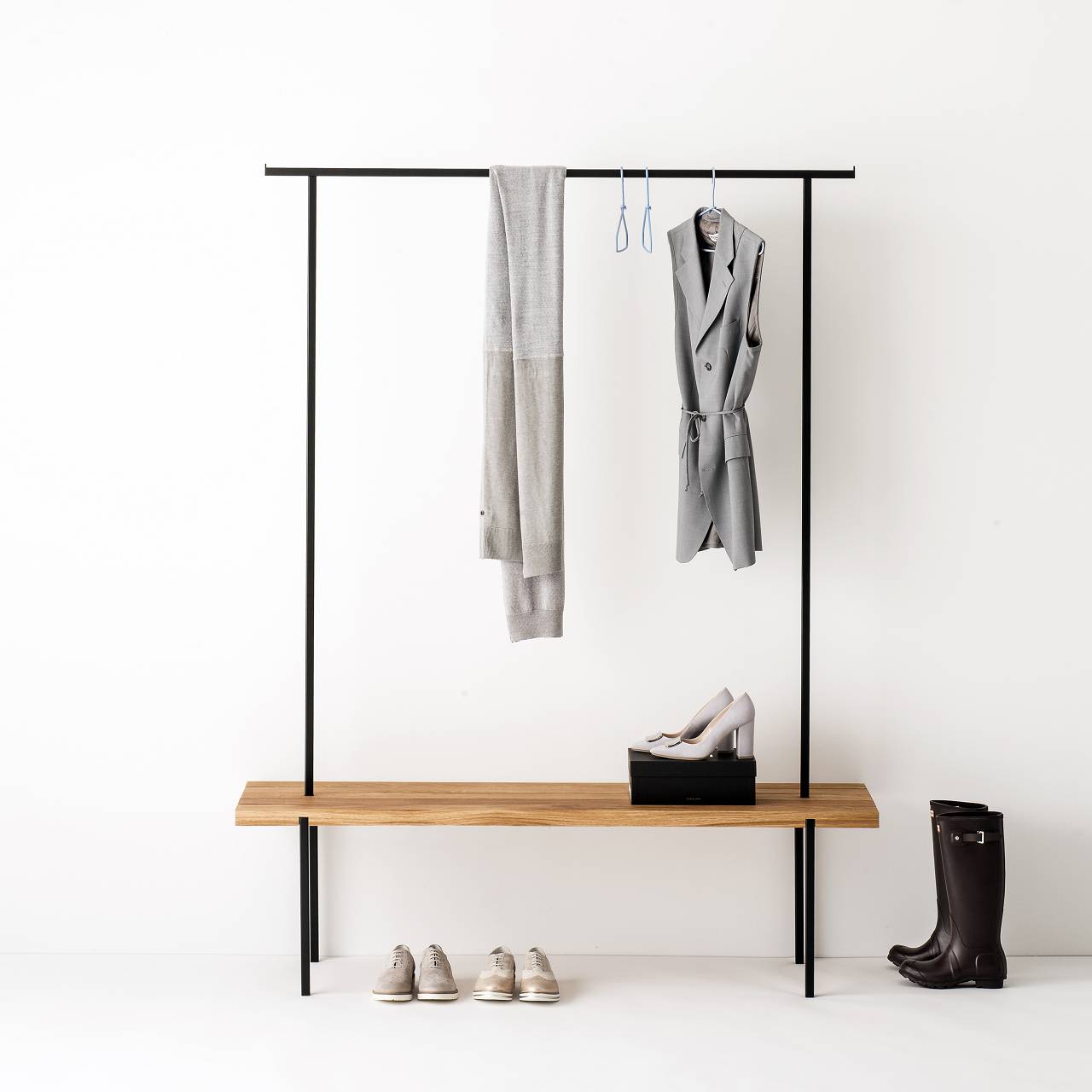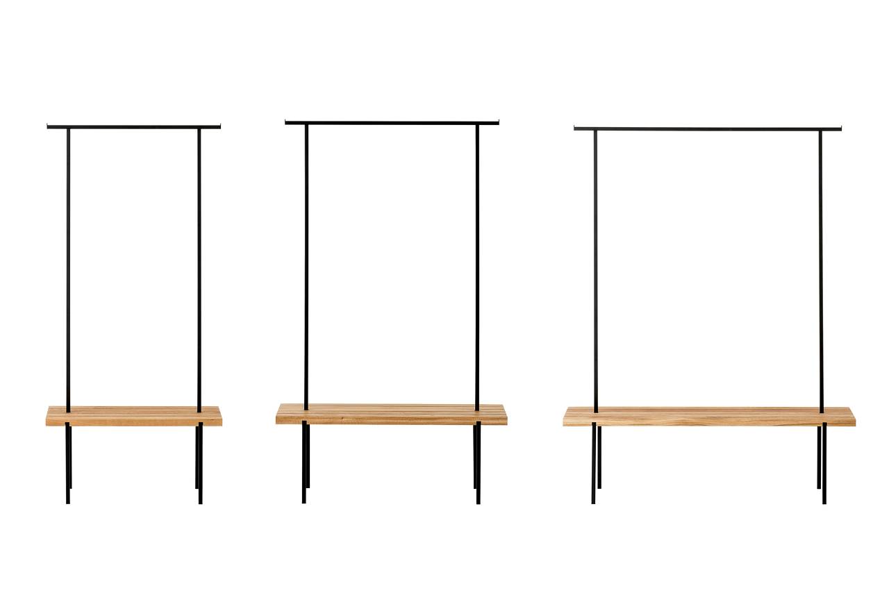 Sie bietet Platz zum Hinsetzen, um bequem Schuhe zu binden und Stellfläche für Taschen. Ausreichend Hängemöglichkeit für Jacken, Mänteln und Kleidung bietet das handgeschweißte Gestänge. Die Garderobe ist in drei Größen erhältlich (S 90 × 40 × 160 cm, M 117 × 40 × 160 cm, L 150 × 40 × 160 cm) und passt so in jede Raumgröße.
