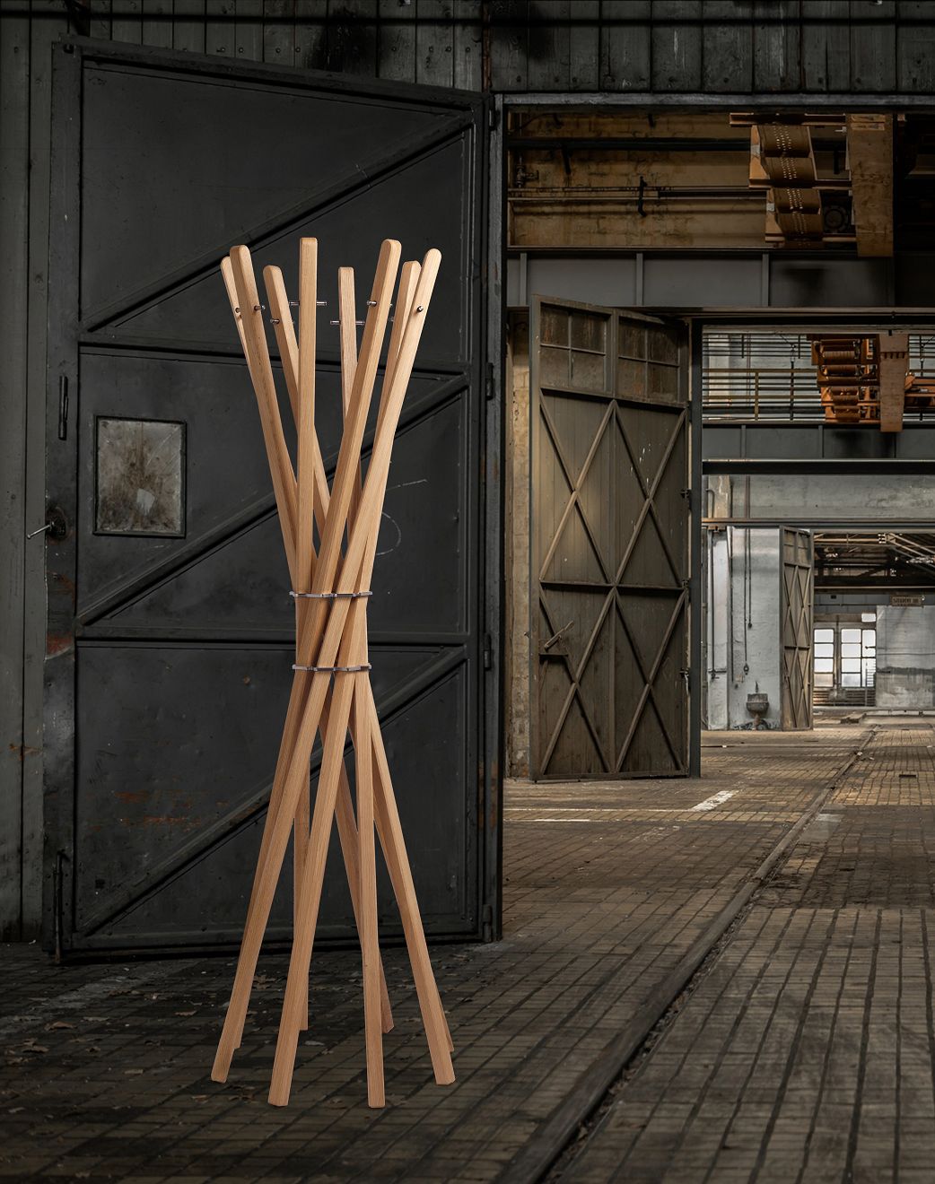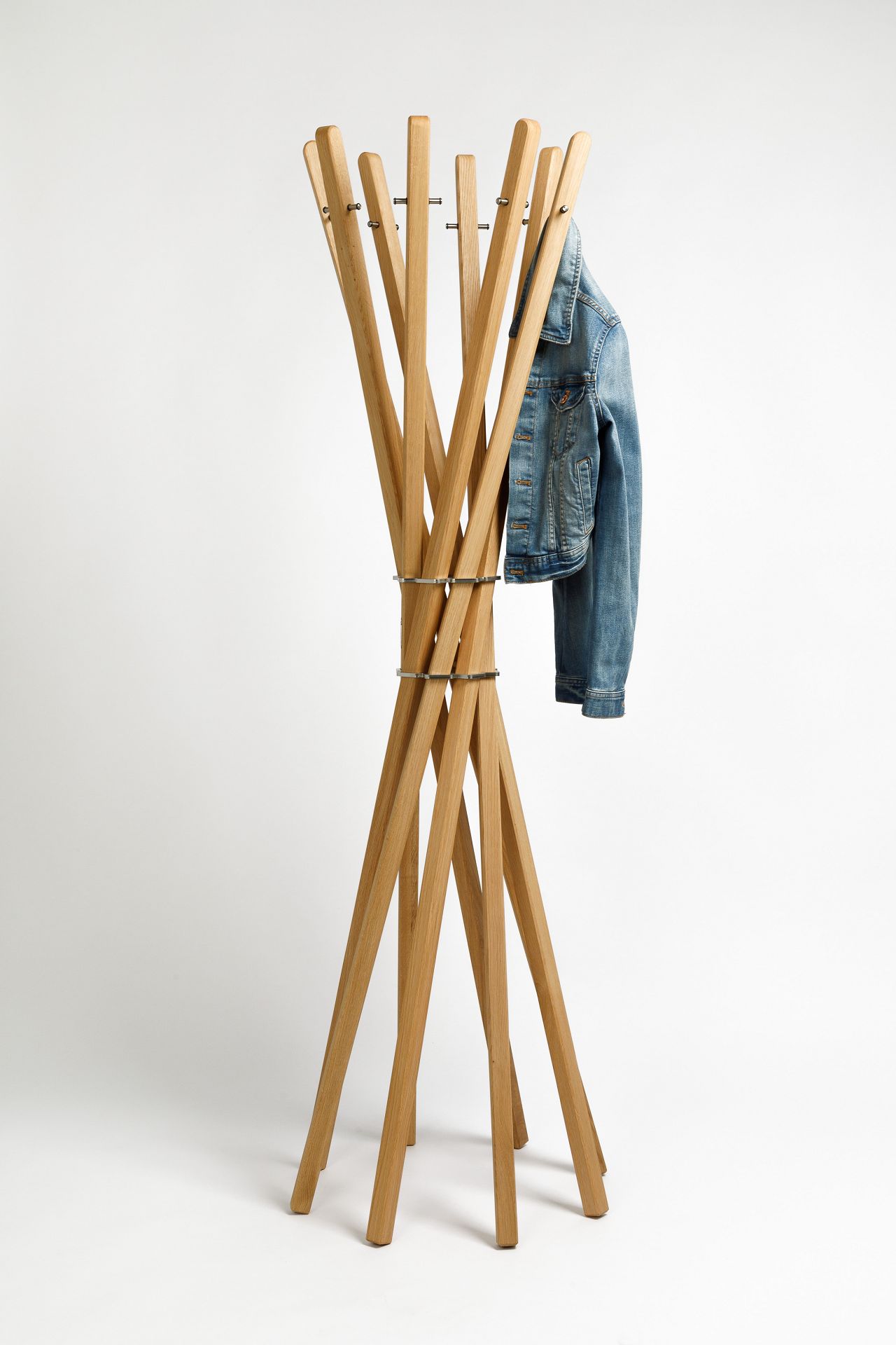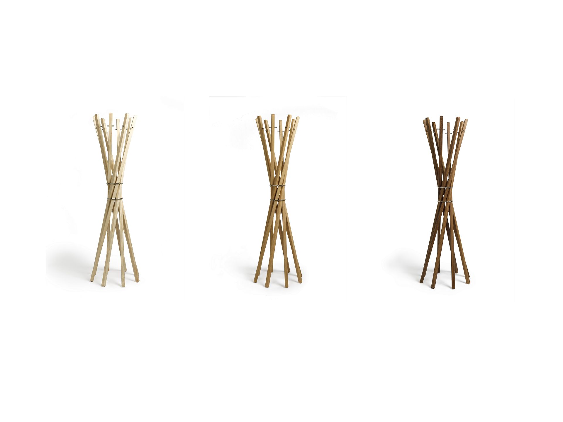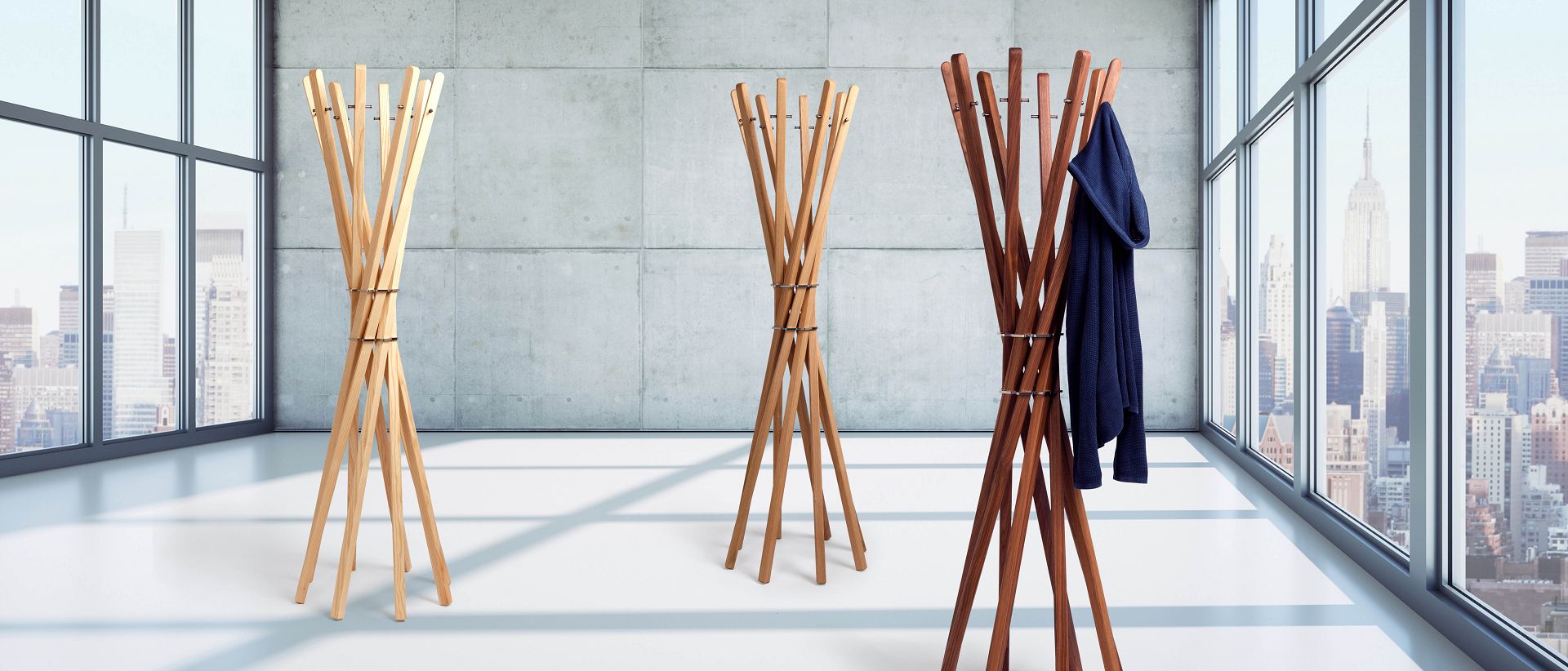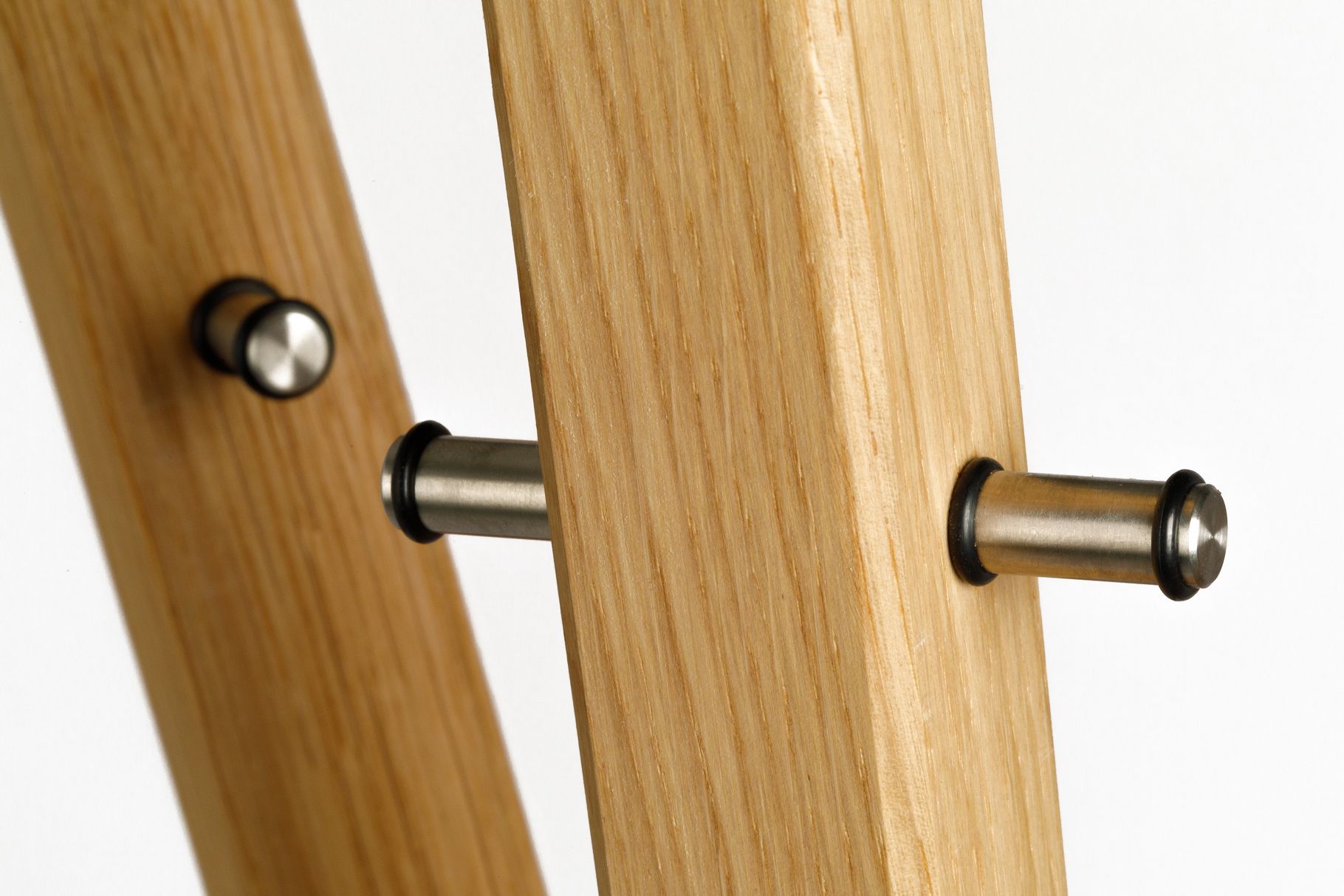 Diese Standgarderobe besteht aus genau acht Stäben mit insgesamt 16 Aufhängemöglichkeiten aus Edelstahl und ist in Esche-, Eiche- und Walnussholz erhältlich.
