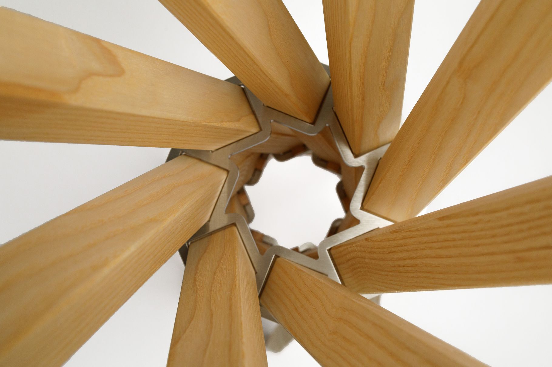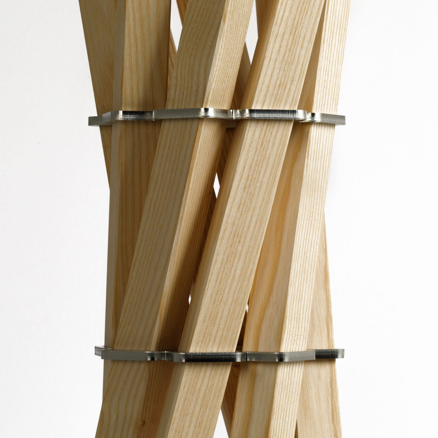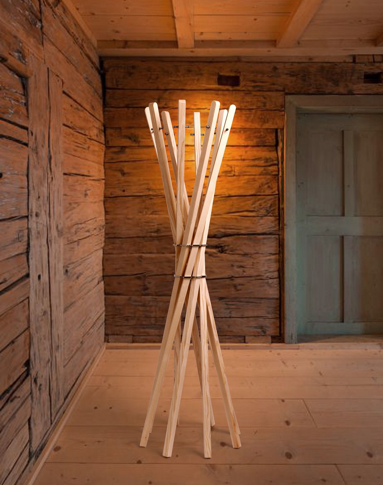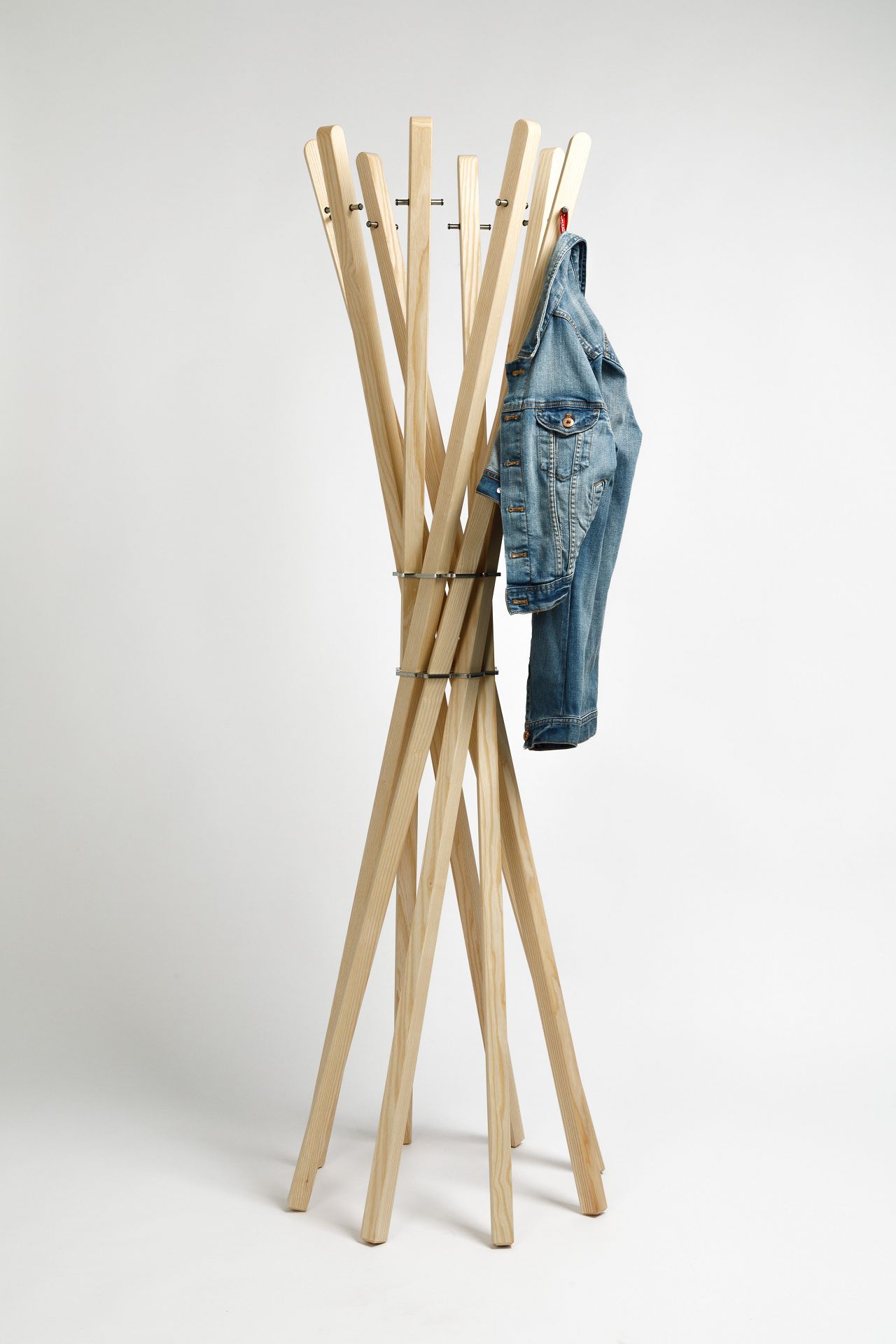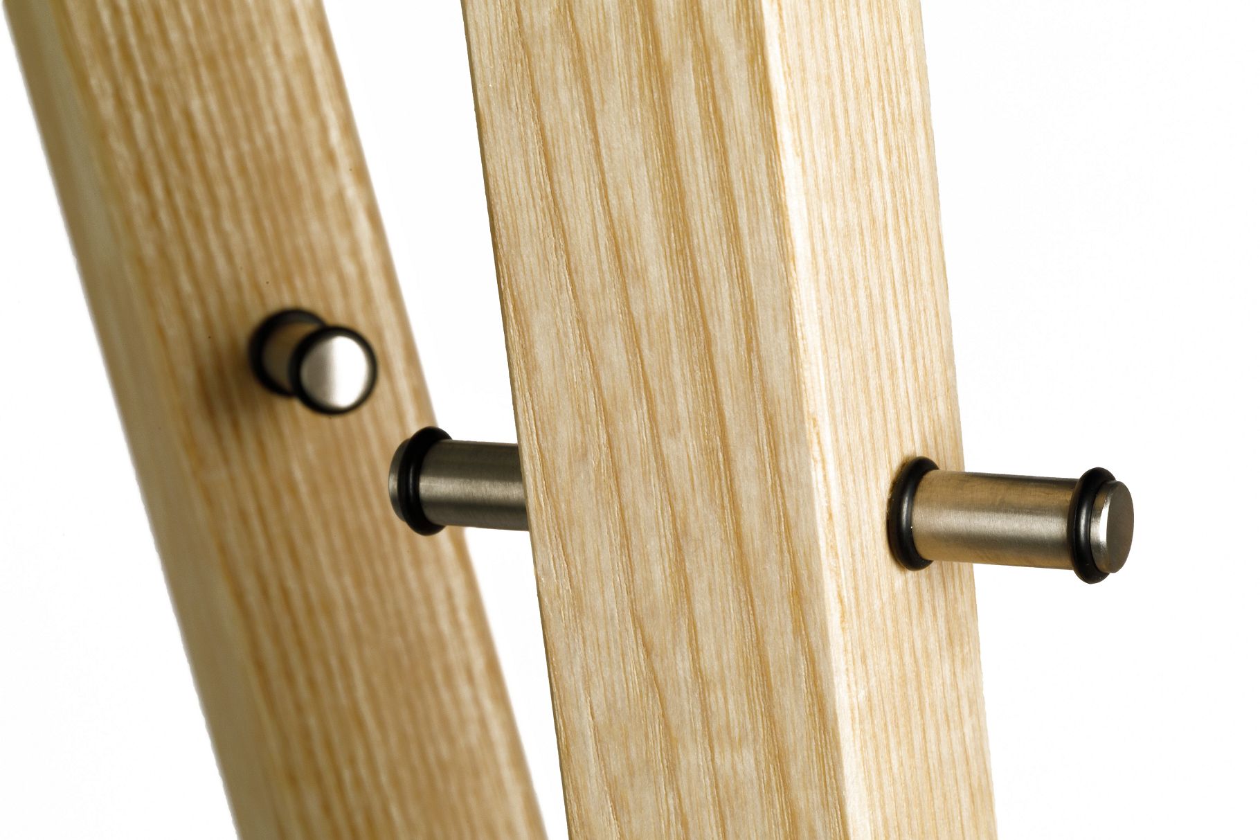 Diese Standgarderobe besteht aus genau acht Stäben mit insgesamt 16 Aufhängemöglichkeiten aus Edelstahl und ist in Esche-, Eiche- und Walnussholz erhältlich.