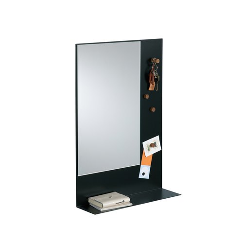 Der Wandspiegel EL MIRROR von Konstantin Slawinski ist ein zuverlässiger und vielseitiger Helfer im Alltag. Der Spiegel ist auf einer magnetischen Pinnwand befestigt. Hier können Sie mit Hilfe der drei im Lieferumfang enthaltenen Pinnwandmagnete Ihre Notizen und Bilder aufhängen. Außerdem erhalten Sie einen stark haftenden Schlüsselhaltermagnet in geölter Eiche. Falls notwendig können zusätzliche Magnete nachbestellt werden. Die Ablage der magnetischen Pinnwand bietet außerdem ausreichend Platz um kleinere Alltagsgegenstände hier abzulegen.