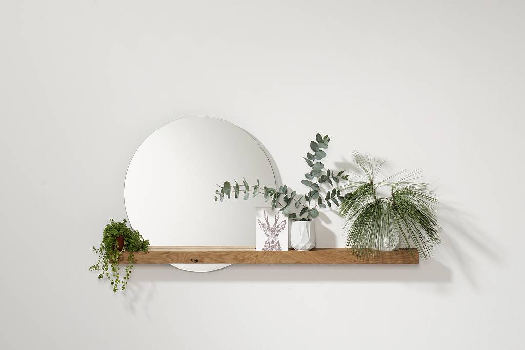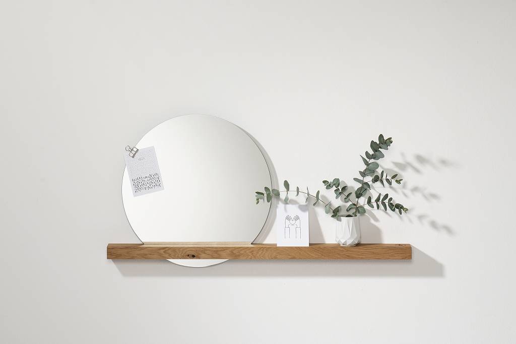 Der Wandspiegel mit Eichenbrett 100 x 7,5 x 4 cm, Spiegel ∅ 50 cm von weld & co besteht aus einem Spiegel und einer Eichenholzablage. Das Ablagebrett hat eine Fräsung, in der Sie den Spiegel ganz einfach einstecken können und dieser so perfekt in der Holzleiste hält. Die zierliche Ablage beseht aus dem Material geölter Eiche und ist somit stabil und hochwertig. Der Spiegel hat einen Durchmesser von 50 cm und die Holzablage hat die Maße 100 x 7,5 x 4 cm. Funktion und schönes Design, das bietet Ihnen der Wandspiegel von weld & co, welcher sich für den Wohnbereich, Eingangsbereich und für das Schlafzimmer eignet. Ein besonderes Highlight des hochwertigen Spiegels ist, dass Sie in die Fräsung der Leiste, Bilder hineinstecken können und so Ihren Eingangsbereich mit schönen Erlebnissen und Erinnerungen gestalten können. Nicht nur im Wohnbereich ist der Wandspiegel mit Eichenbrett einsetzbar, gerne können das nützliche Produkt auch in Ihrem Bad als Wandaccessoire verwenden. Die Bilderleiste wird ganz leicht mit zwei Schrauben an der Wand befestigt, im Lieferumfang ist Befestigungsmaterial enthalten. Zur Reinigung der Leiste verwenden Sie bitte einen Staubwedel oder ein feuchtes Tuch und reinigen Sie diese nur mit milden Reinigern. Nasse Flecken sollten direkt entfernt werden. Bei uns im Shop erhalten Sie auch den Wandspiegel mit der Holzablage Nussbaum.
