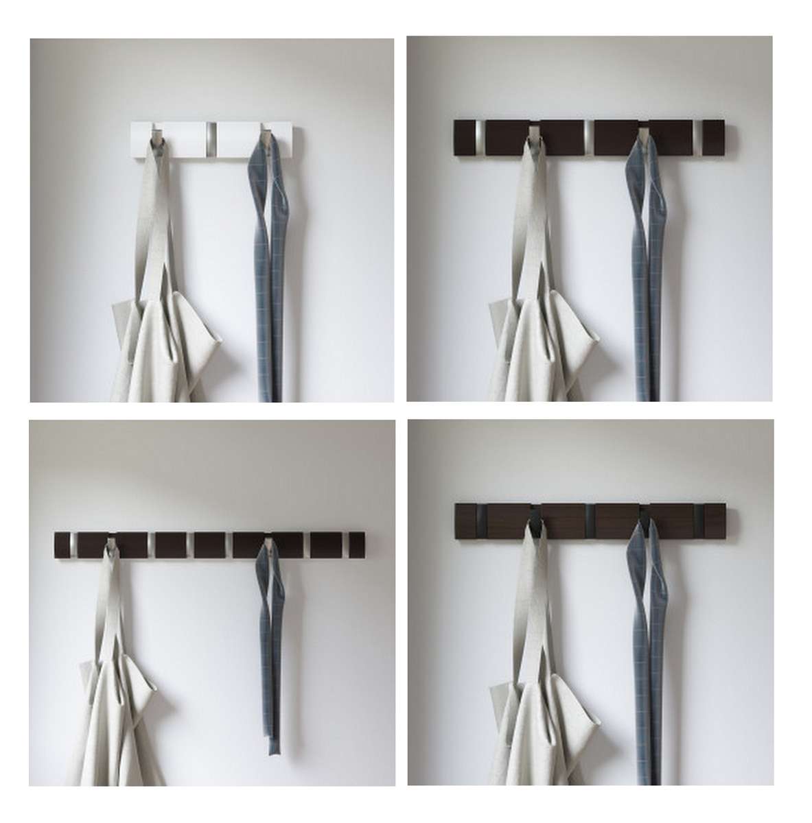 Die FLIP Garderobenleiste von Umbra ist eine moderne und funktionale Garderobenleiste welche mit 3, 5 oder 8 Haken und in unterschiedlichen Farben erhältlich ist. Die Wandgarderobe verfügt über klappbare Haken, die sich bei Nichtgebrauch einfach zurückklappen lassen. Trotz seines schlichten und raumsparenden Designs bietet Flip überraschend viel Platz und macht die Garderobe zu einem perfekten Halter für Jacken, Schals, Taschen und mehr. Die Flurgarderobe mit beweglichen Haken fügt sich auch in einen schmalen Flur perfekt ein und wirkt nicht zu aufdringlich. Stylisch - platzsparend und praktisch dafür steht das Design Wandgarderobe.