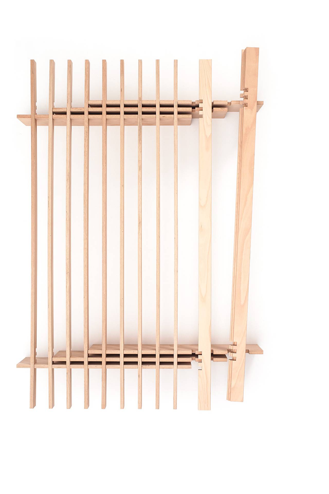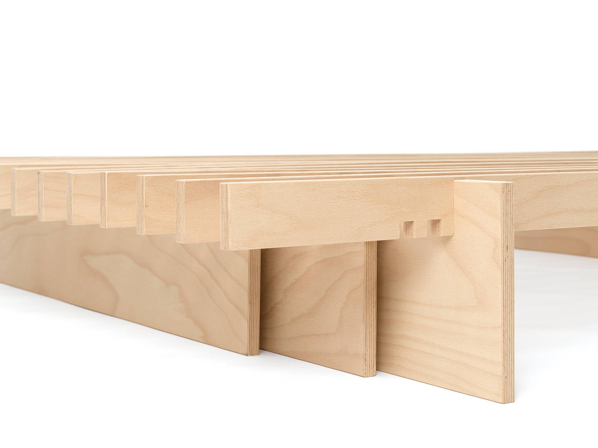 Das Tojo Bett parallel L passt sich den Wünschen und Bedürfnissen seines Besitzers an. Das variable Bettsystem verzichtet auf Schrauben oder Beschläge und kann so einfach und ohne weitere Hilfe zusammen gesteckt werden. Die Latten werden längs in die 6 Auflagen eingesteckt. Die Zahl der Latten variiert nach der gewünschten Bettbreite.