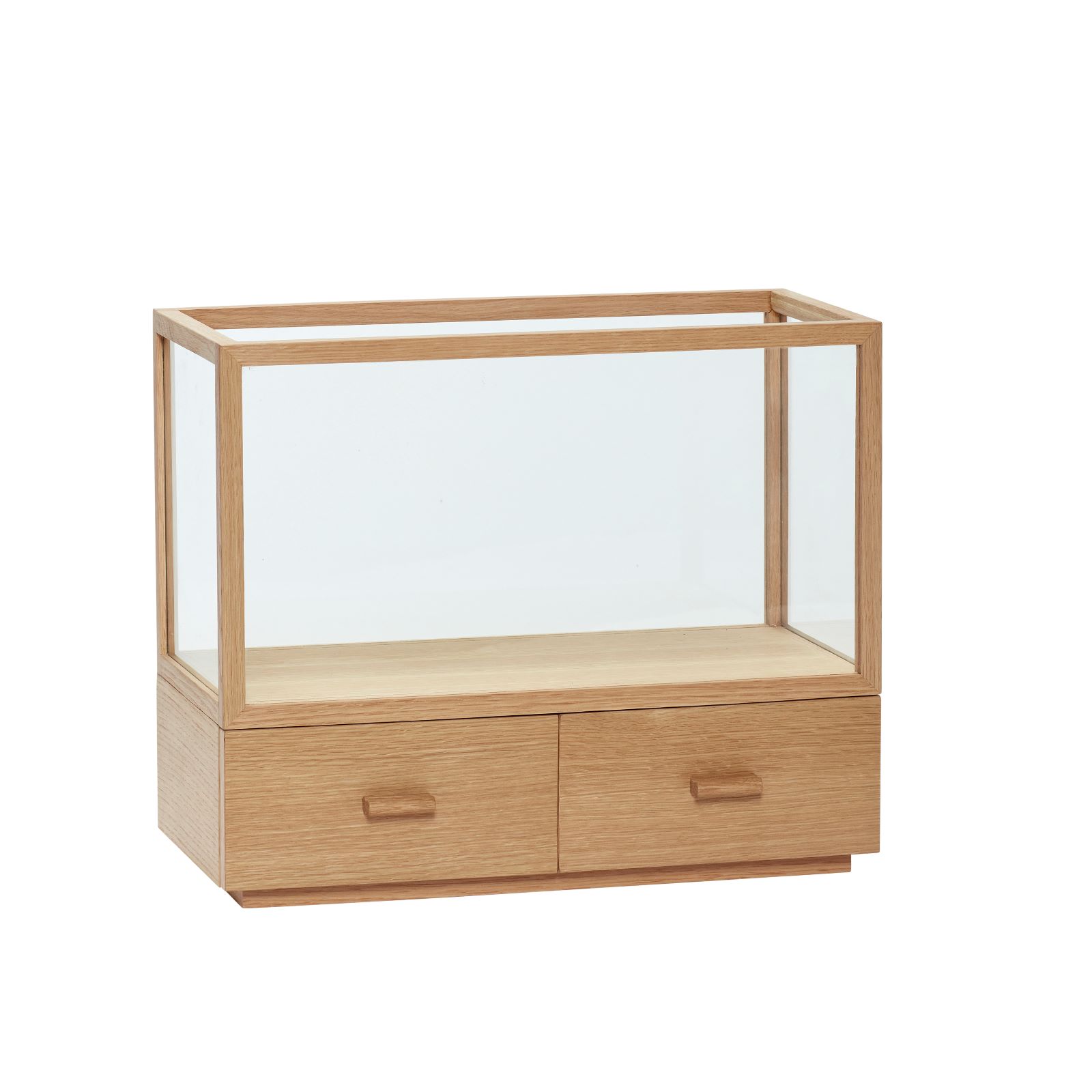 Das klare Glas ermöglicht eine transparente Sicht auf die ausgestellten Objekte, während das natürliche Eichenholz einen warmen und einladenden Charme verleiht. Das schlichte und dennoch elegante Design fügt sich nahtlos in jedes Interieur ein und wird zum Blickfang in jedem Raum.