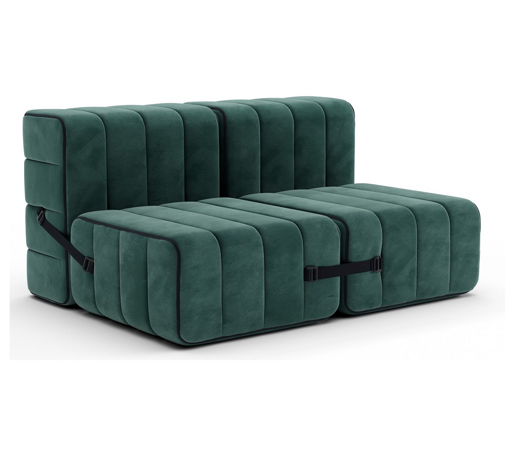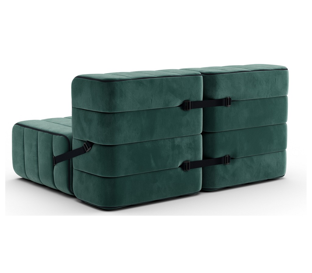 Der Zweisitzer besteht aus vier der Couchmodule. Zwei werden als Sitz- und Liegefläche verwendet und zwei weitere als Rückenlehne. Die Module aus Stoff werden mit Gurten befestigt, sodass die Module nicht verrutschen können.