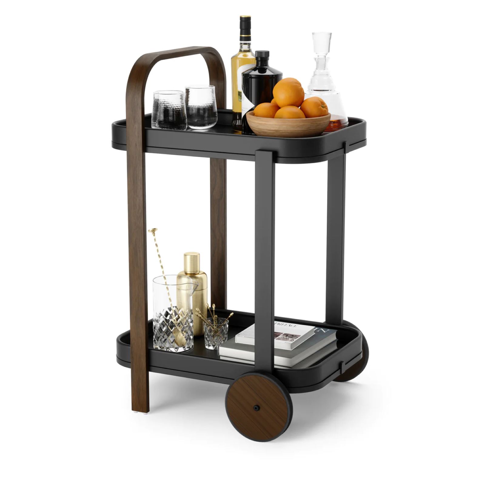 Mit dem Bellwood Servierwagen schwarz von Umbra können Sie Ihr Zuhause in ein echtes Cocktail-Paradies verwandeln! Der moderne, zweifarbige Barwagen aus Holz ist der perfekte Begleiter, um eine praktische Aufbewahrungslösung in Ihrer Wohnung zu erhalten. Er ist ein echtes Allround-Talent und kann als Bareinrichtung, Beistelltisch für den Innenraum oder Gartenwagen verwendet werden. Dank der gummierten Räder kann der Holzwagen leicht bewegt werden und auch eine einfache Reinigung ermöglichen. Auf zwei Ebenen haben alle Ihre Barwerkzeuge, Stielgläser, Dekorationen genügend Platz. Der Bellwood Servierwagen schwarz von Umbra ist außerdem umweltfreundlich, da er aus nachhaltigen Holzquellen gewonnen und mit einer nachhaltigen Oberfläche versehen wurde.