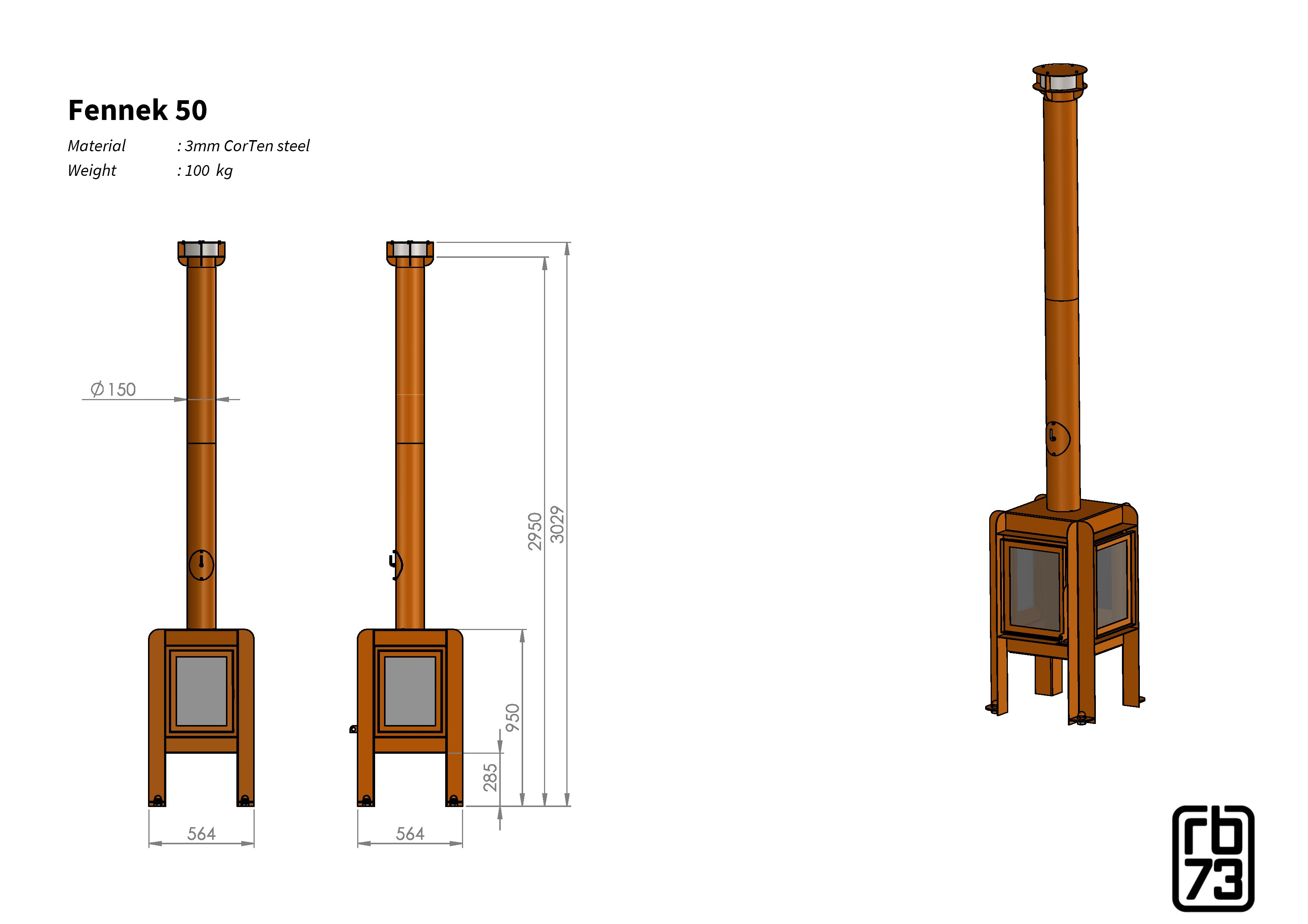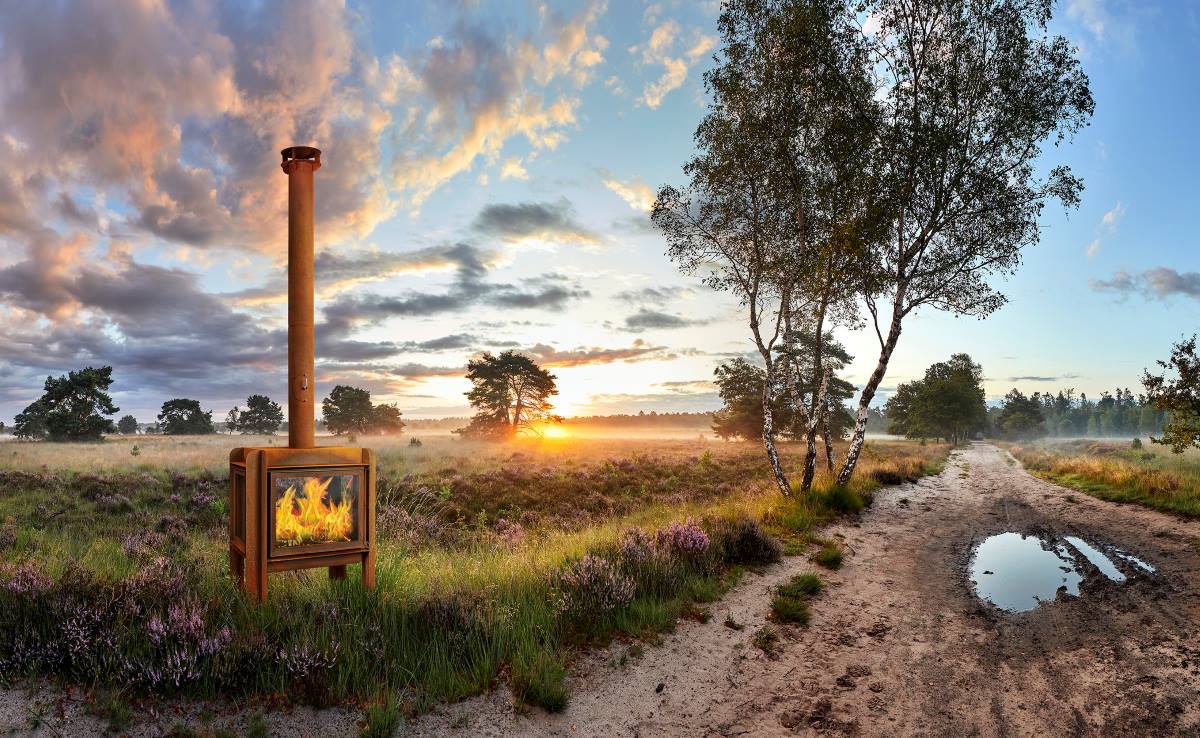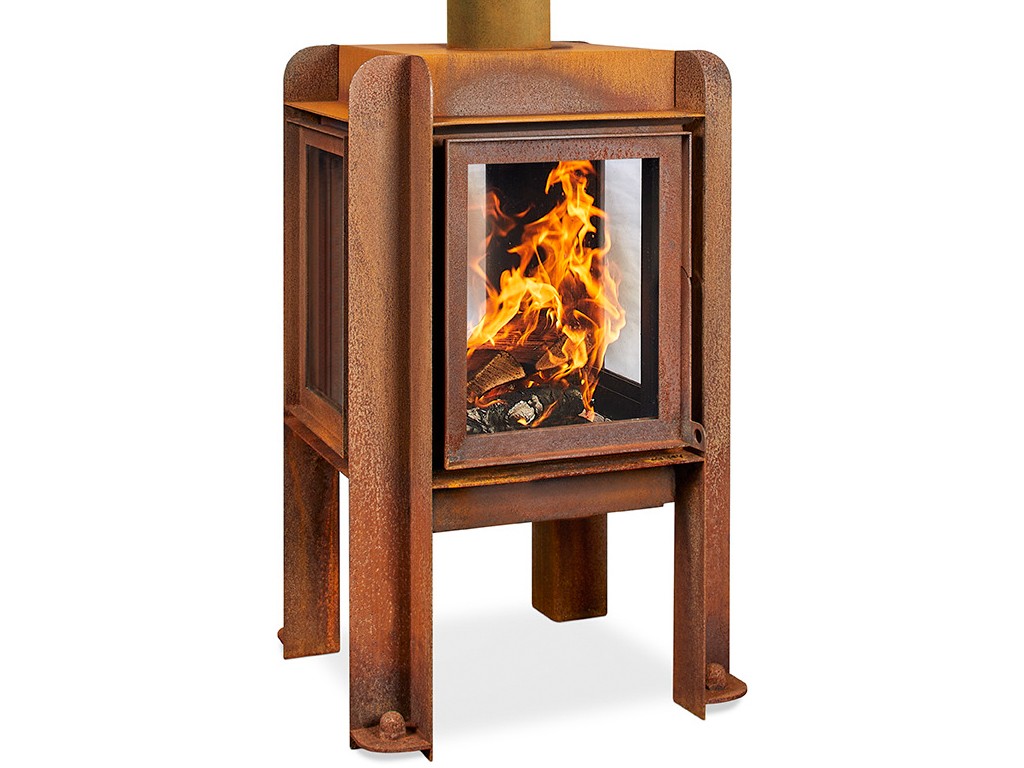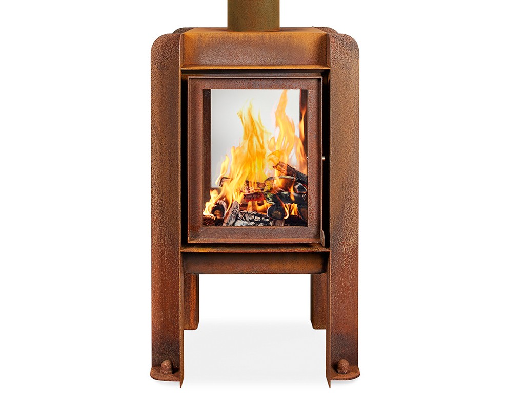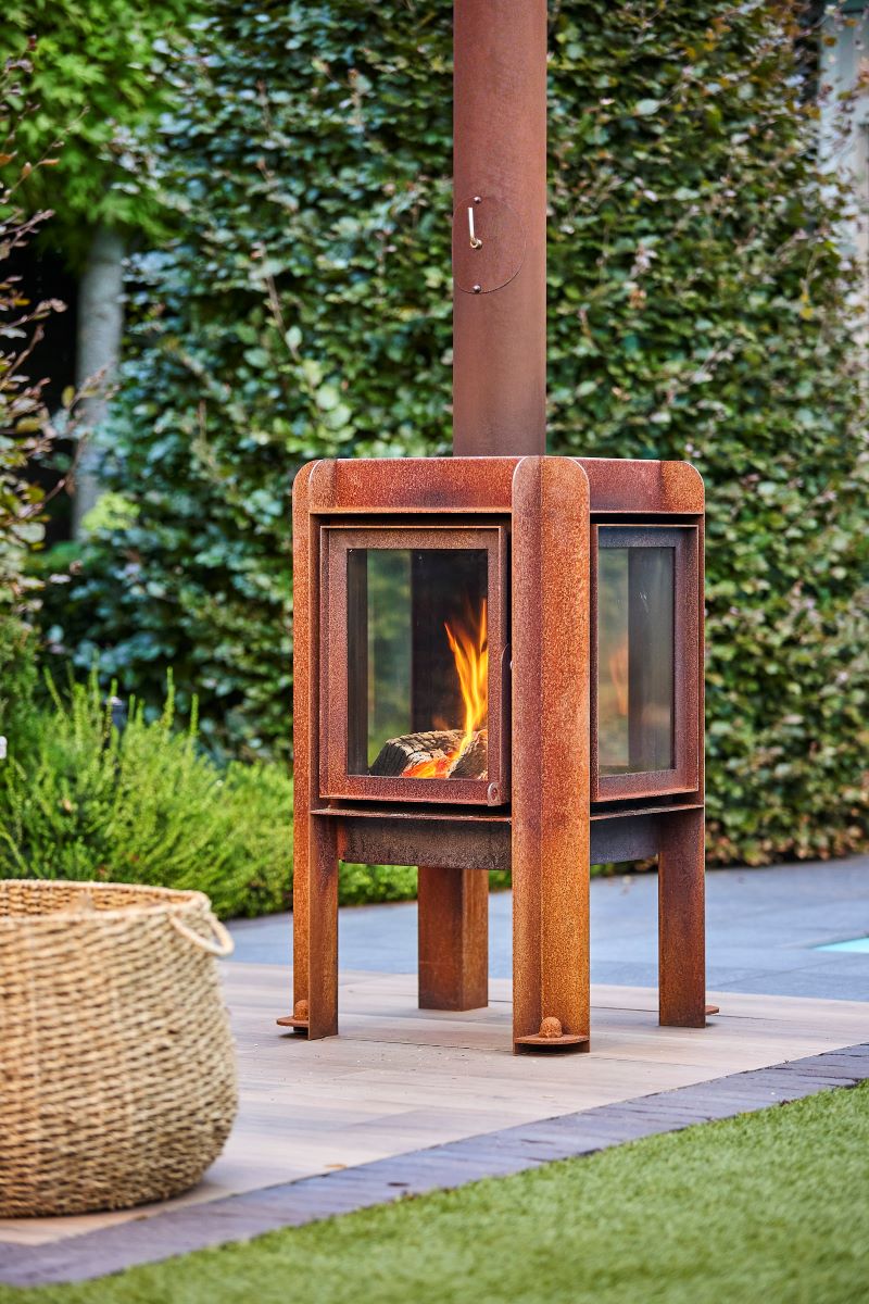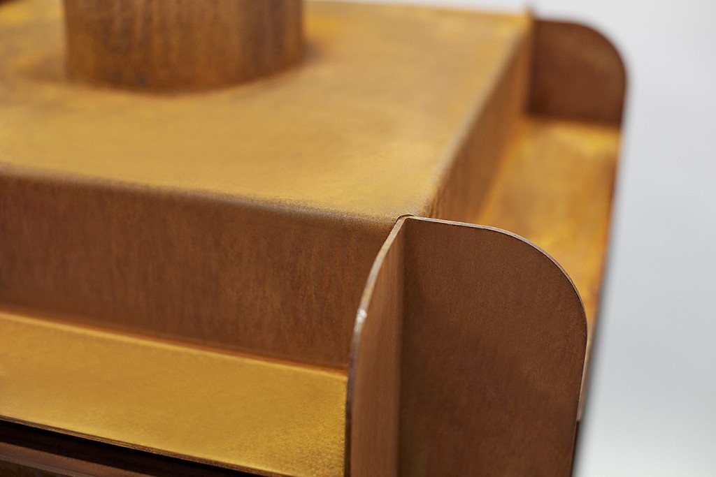 Der Ofen ist aus Cortenstahl gefertigt. Die Besonderheit des Materials besteht in dem Rostprozess, welcher erst nach einiger Zeit einsetzt.