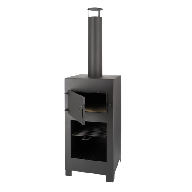 Im oberen Bereich befindet sich ein integrierter Pizzaofen, der durch die aufsteigende Hitze gleichmäßig backt – ideal für hausgemachte Pizzen mit knusprigem Boden.