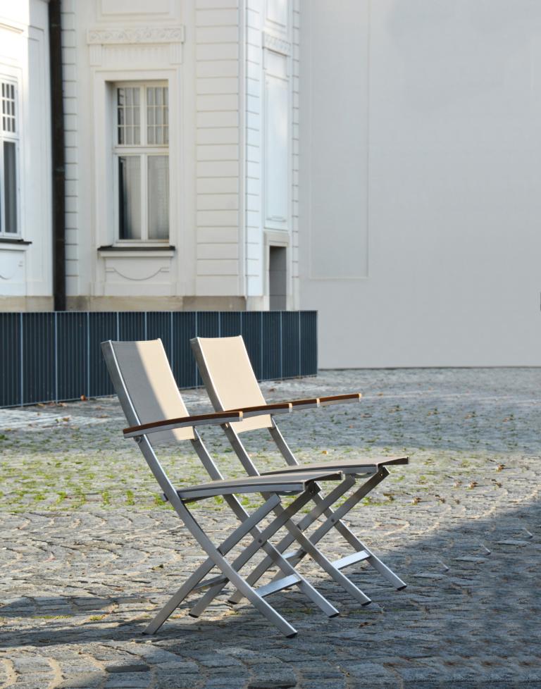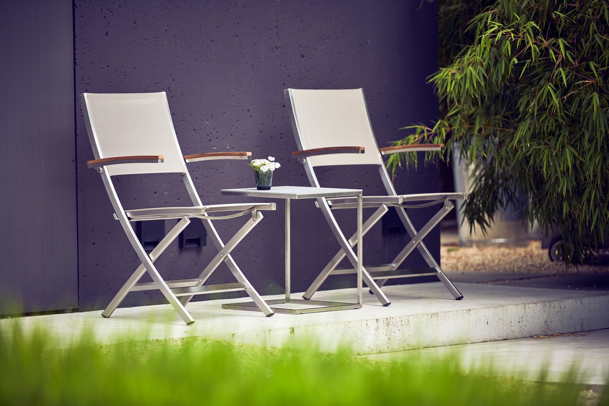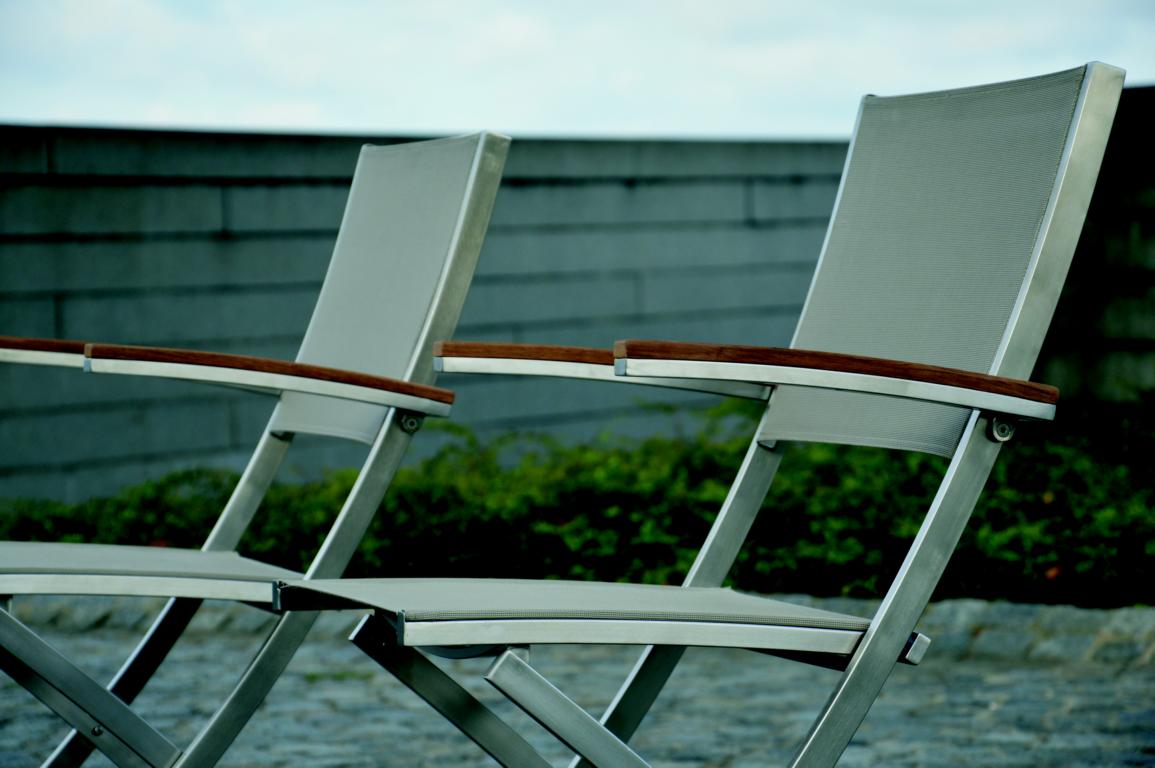 Der Lux Balcony Klappstuhl von Jan Kurtz ist ein Gartenstuhl der Extraklasse. Hier trifft mordernes Design auf erstklassige Qualität in Punkten Verarbeitung sowie Material. Das Gestell dieses Stuhls besteht aus geschliffenem Edelstahl - dieser sorgt nicht nur für hohe Stabilität, sondern sieht gleichzeitig auch sehr gut aus. Auch der Bezug ist besonders - wetterfestes und UV-Beständiges Batyline. Dann verfügt der Klappstuhl noch über die 66,5 cm hohen Armlehnen, welche aus Teakholz sind und eine menge zu dem Design beitragen. Das Teakholz in Verbindung mit dem silbernen Stahl, stellt einen wunderschönen Kontrast dar und verleiht dem Stuhl den besonderen Charme. Die Maße des Stuhls sind 85 cm in der Höhe, 55 cm in der Breite und 65 cm in der Tiefe.