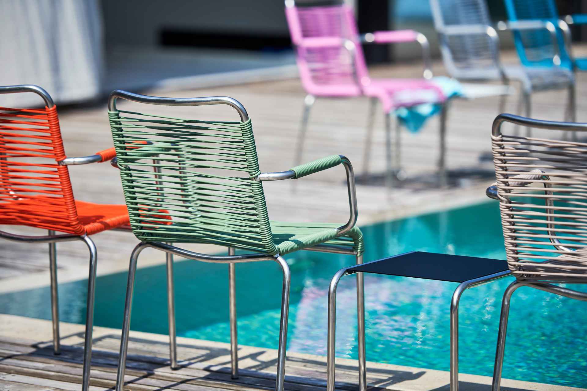 Der MYA Spaghetti lässt sich stapeln, was ihn zur idealen Lösung für kleinere Balkone, Terrassen oder auch für die Gastronomie macht. So sparen Sie Platz, wenn der Sessel gerade nicht gebraucht wird.
