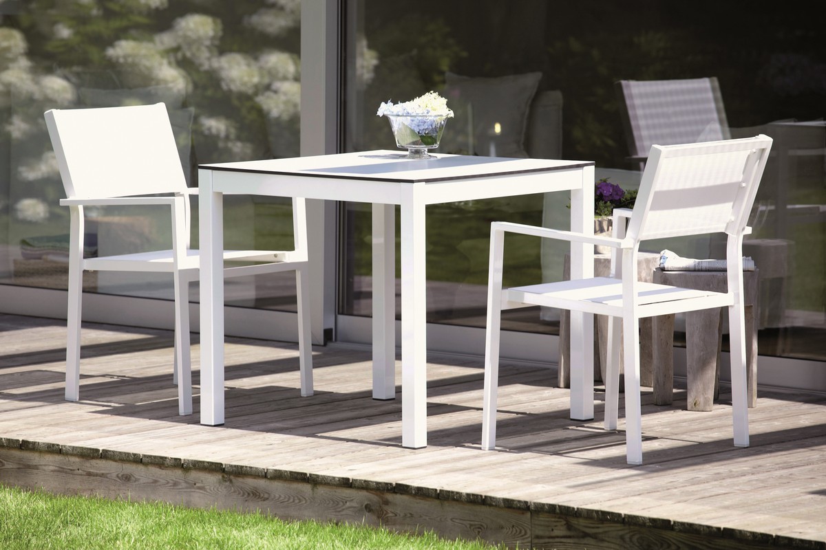 Abbildung zeigt Outdoor Tisch Quadrat mit Platte Keramik Grau weiß, Gestell Aluminium/Schwarz.