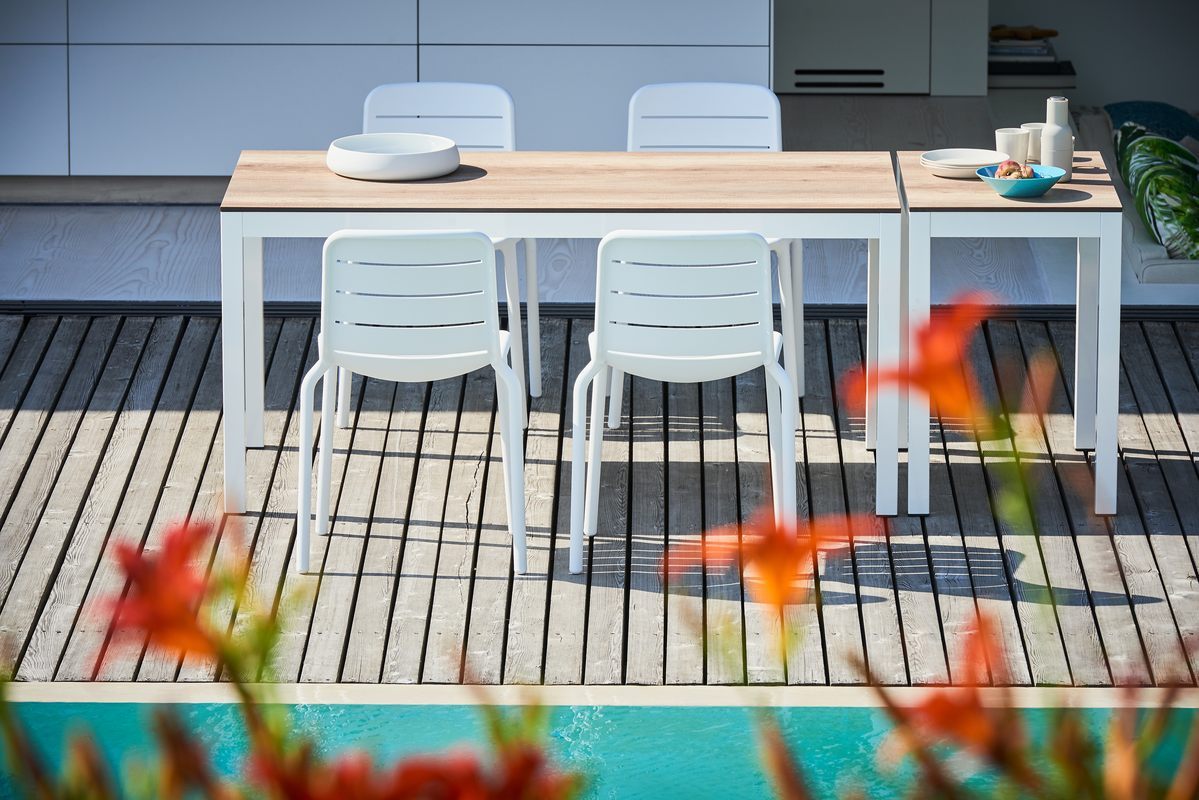 Abbildung zeigt Tisch Quadrat in diversen Größen, Platte Teak, Gestell Aluminium/Weiß.