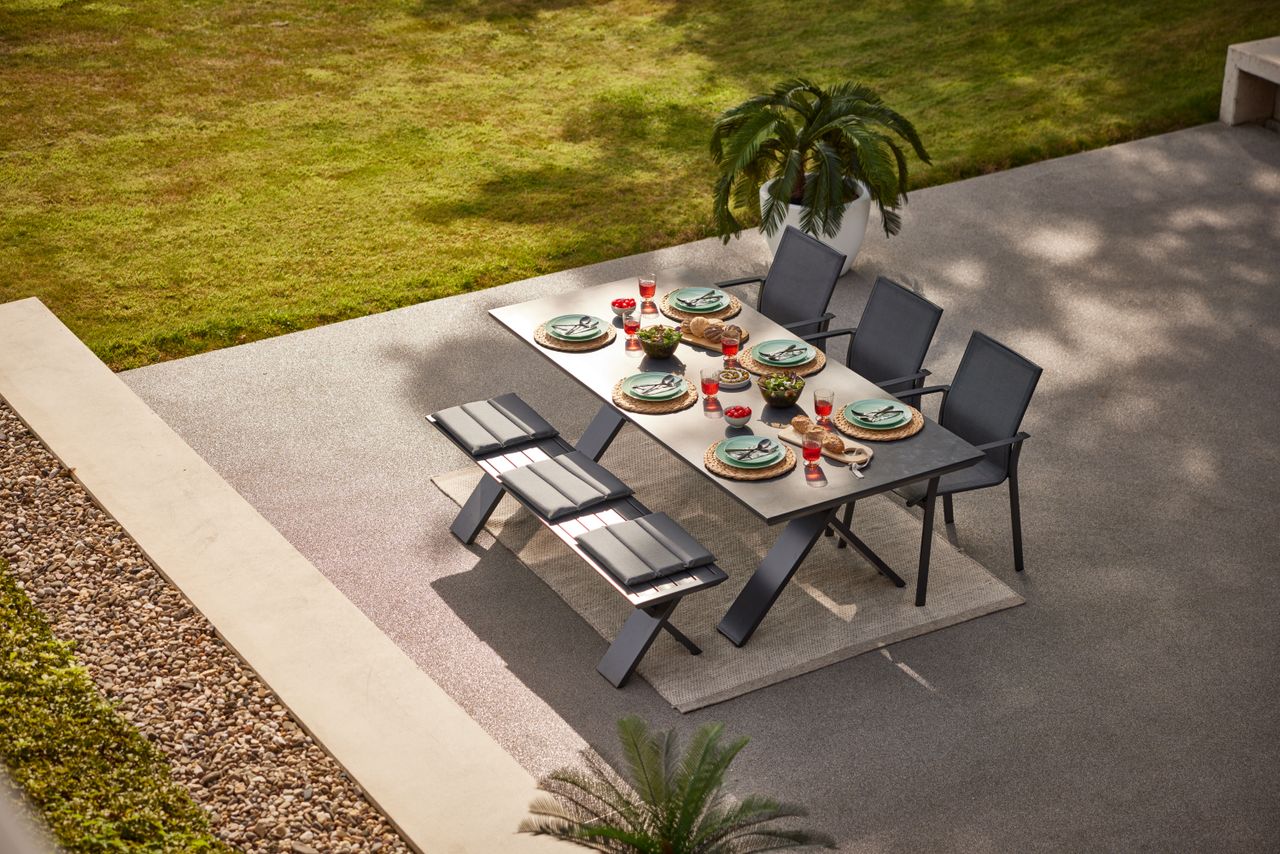 Der Xanadu Keramik Outdoortisch von Hartman ist ein atemberaubendes, langlebiges Designerstück für Ihren Außenbereich. Die Keramikplatte ist nicht nur kratzfest und farbbeständig, sondern auch witterungsbeständig und damit ideal für den Einsatz bei jedem Wetter. Außerdem ist die Keramikplatte leicht zu reinigen - egal, wo Sie diesen Tisch aufstellen, er wird immer makellos aussehen. Das x-förmige Aluminiumgestell hat ein zeitloses Design, dass immer ein Hingucker ist. Die Xanadu-Bank passt perfekt zu diesem eleganten Tisch für den Außenbereich - denn wer liebt es nicht, ein schön abgestimmtes Ensemble für den Outdoorbereich zu haben! Und während seine Langlebigkeit dafür sorgt, das Sie ihn Saison für Saison genießen können, bleibt sein unverwechselbarer Charme Ihren Gästen garantiert in Erinnerung.
