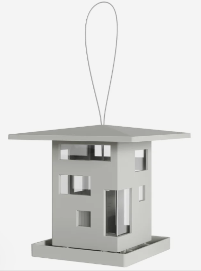 Das graue Vogelhaus Bird Café von Umbra ist eine durchdachte Vogelfutterstation, die mit ihrer würfelförmigen, architektonischen Gestaltung und den asymmetrischen Fenstern auffällt. Die Konstruktion ermöglicht es, das Futter durch die transparenten Kunststofffenster stets im Blick zu behalten, während es durch Öffnungen im Boden in die umlaufende Schale gelangt, auf der die Vögel bequem Platz nehmen und fressen können.