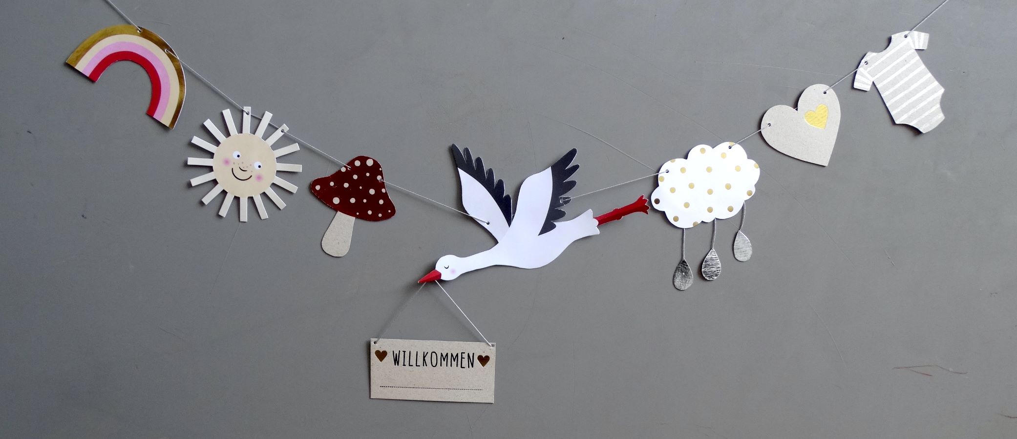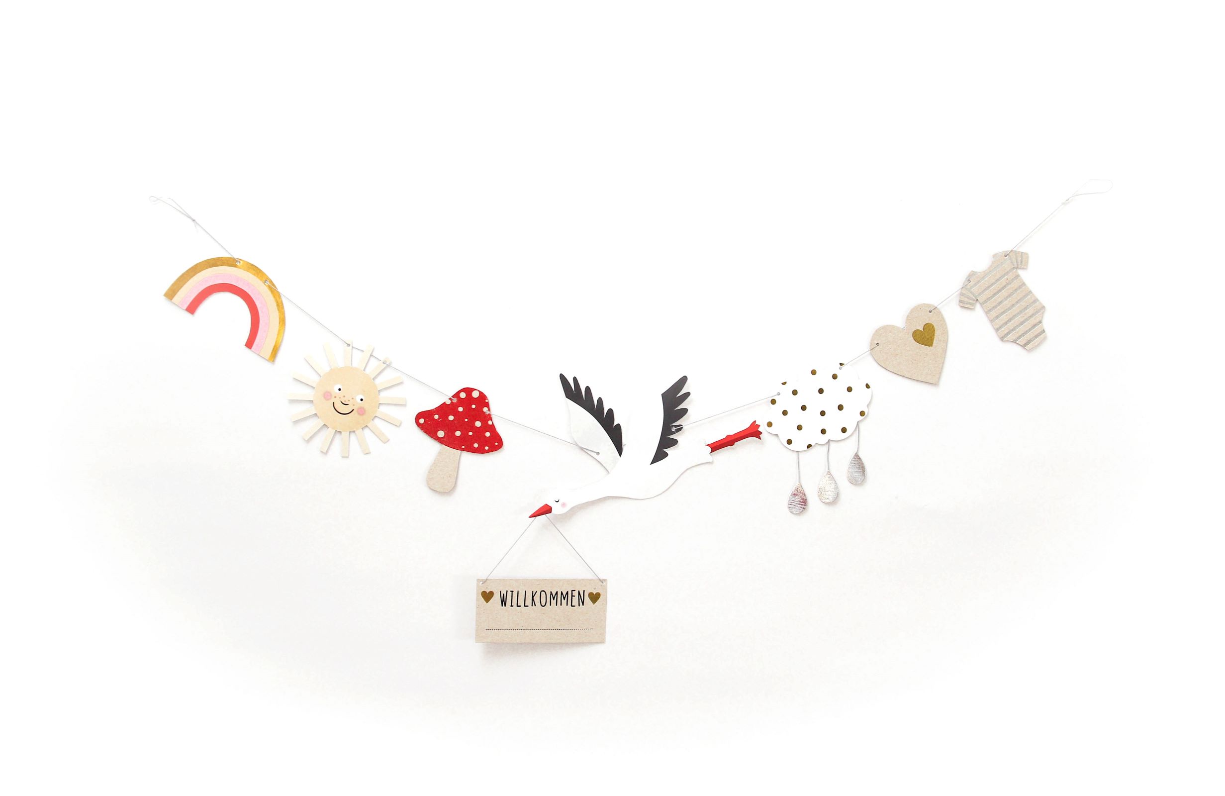 Diese liebevoll gestaltete Girlande ist eine wunderbare Möglichkeit, das Zuhause für die Ankunft des Babys vorzubereiten und einen Hauch von Freude und Glück zu verbreiten. Die Girlande besteht aus verschiedenen niedlichen Anhängern, darunter ein Regenbogen, eine strahlende Sonne, ein fröhlicher Pilz, ein anmutiger Storch, eine fluffige Wolke, ein Herz und ein zarter Strampler - jedes Symbol steht für die Liebe und die Hoffnungen, die mit der Ankunft eines Babys verbunden sind.