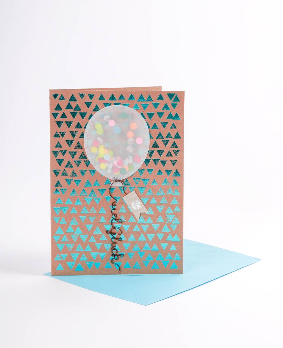 - Design: Handgearbeitete Karte mit zartem Luftballonmotiv und der Aufschrift „Viel Glück“