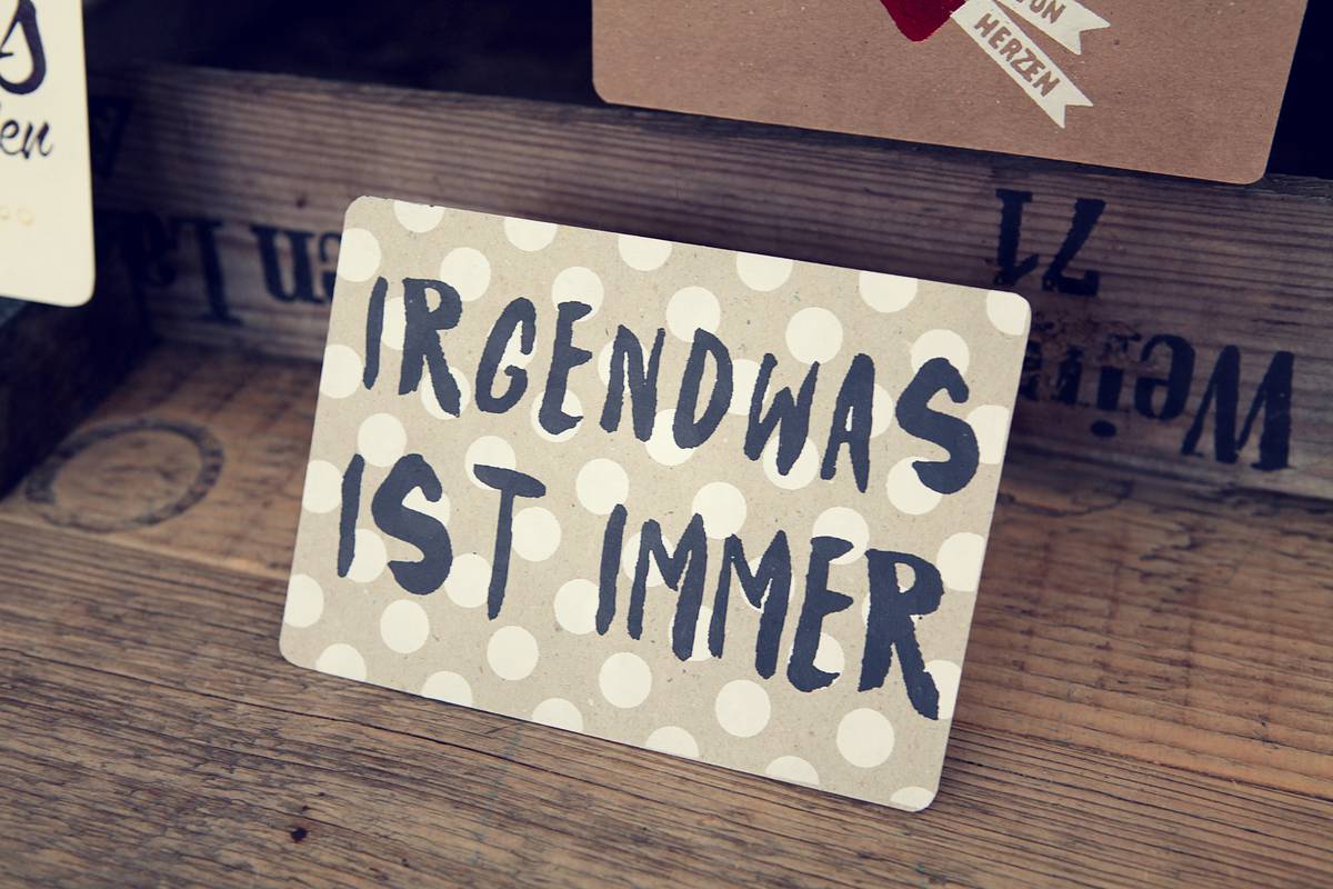 Manchmal braucht es keine großen Worte, um jemandem eine Freude zu machen. Mit der Postkarte „Irgendwas ist immer“ überbringen Sie Ihre Botschaft auf ehrliche, humorvolle und sympathische Weise. Sie passt zu jeder Stimmung und zu jedem Anlass – ein echter Allrounder unter den Grußkarten, der immer ein Schmunzeln hinterlässt.