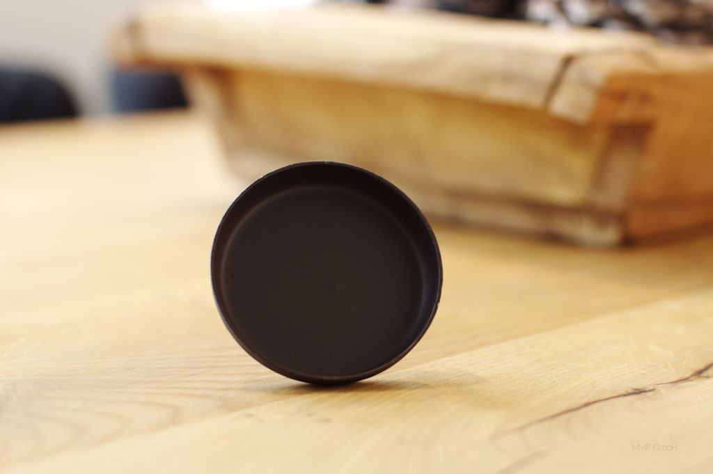 Lackiert ist der Kerzenteller in einem hochwertigen, schwarzbraunen Lack, der ihn elegant und vielseitig kombinierbar macht.